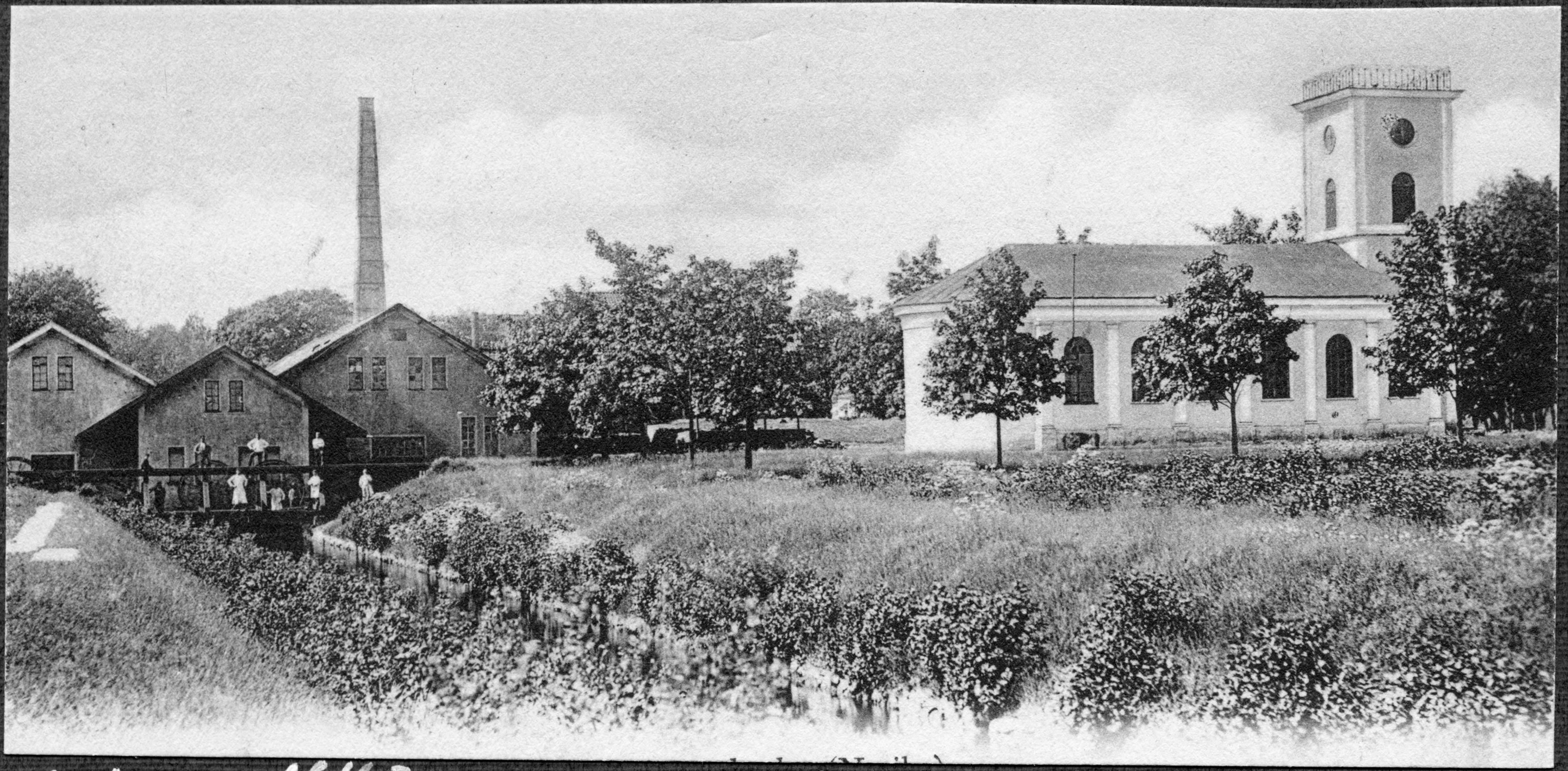 Beskrivning: Kyrkan med några av kyrkbyns mangårdsbyggnader och det före detta gästgiveriet. Från nordväst.