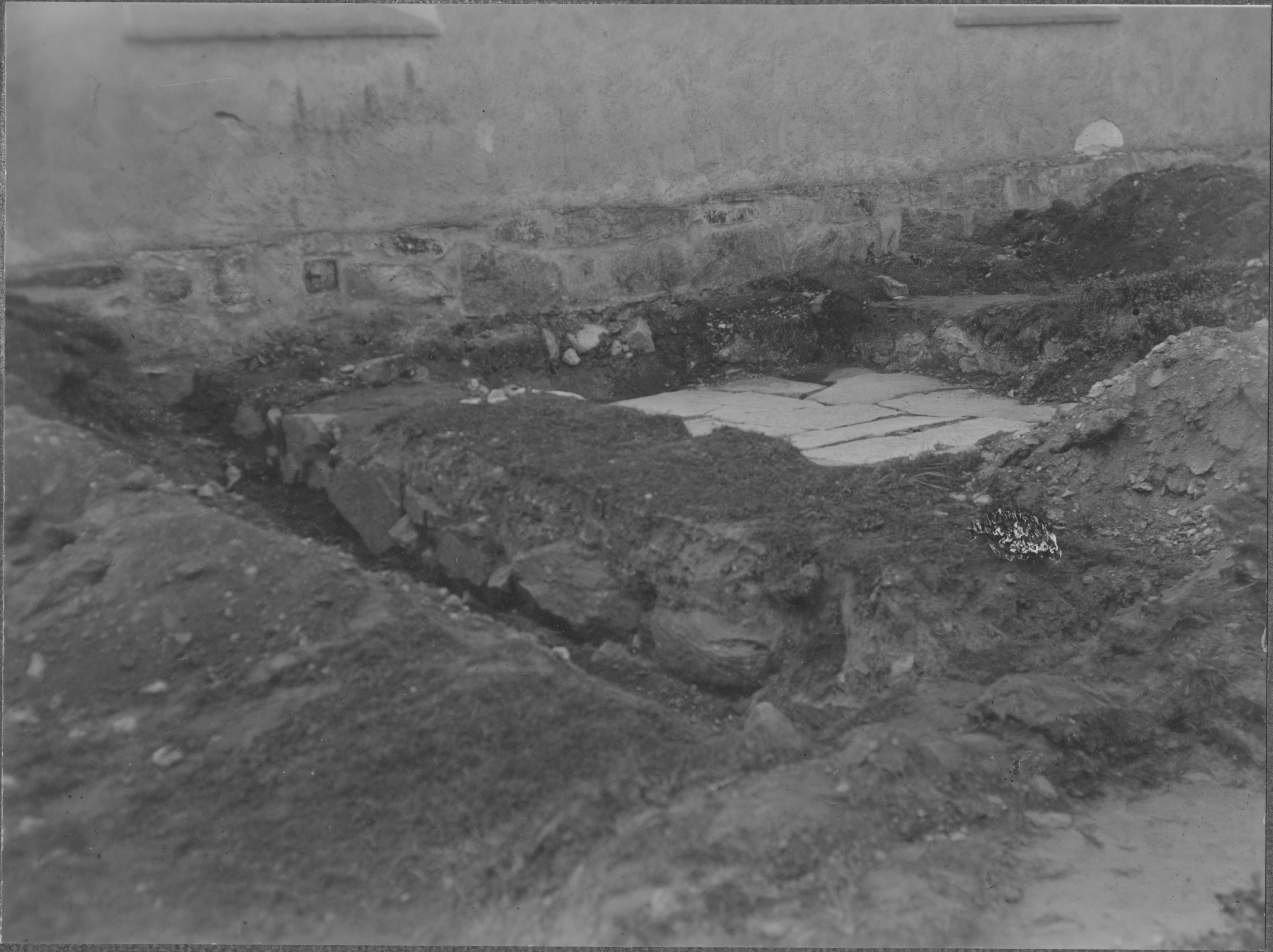 Beskrivning: Grundmur med innanför liggande golv av stenhällar. Från sydost.