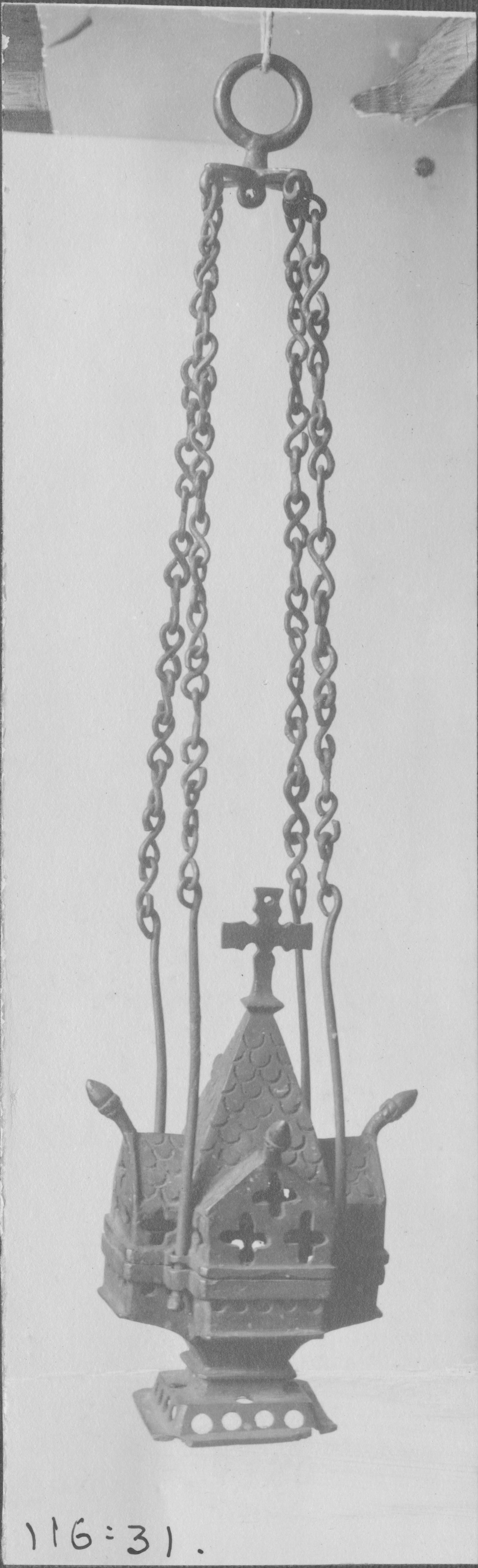 Beskrivning: Rökelsekar, kopparlegering Senmedeltid.
