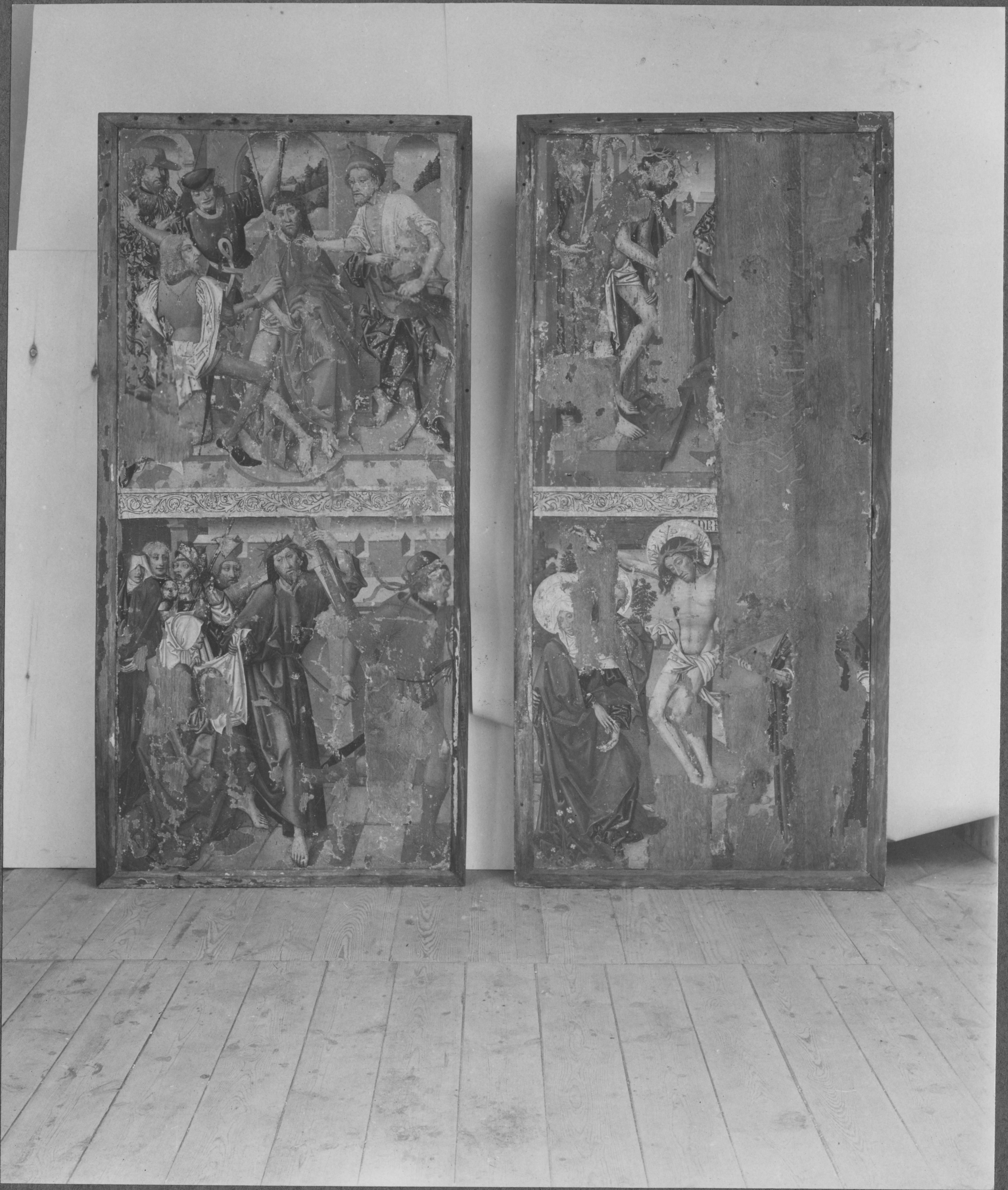 Beskrivning: Altarskåp, Mariaaltarskåpet, av trä med skulpterade figurer. Dörrarna. Från den gamla kyrkan. Omkring 1500. Nordöstra väggen. Efter konservering 1930 av Sven Sundbaum.