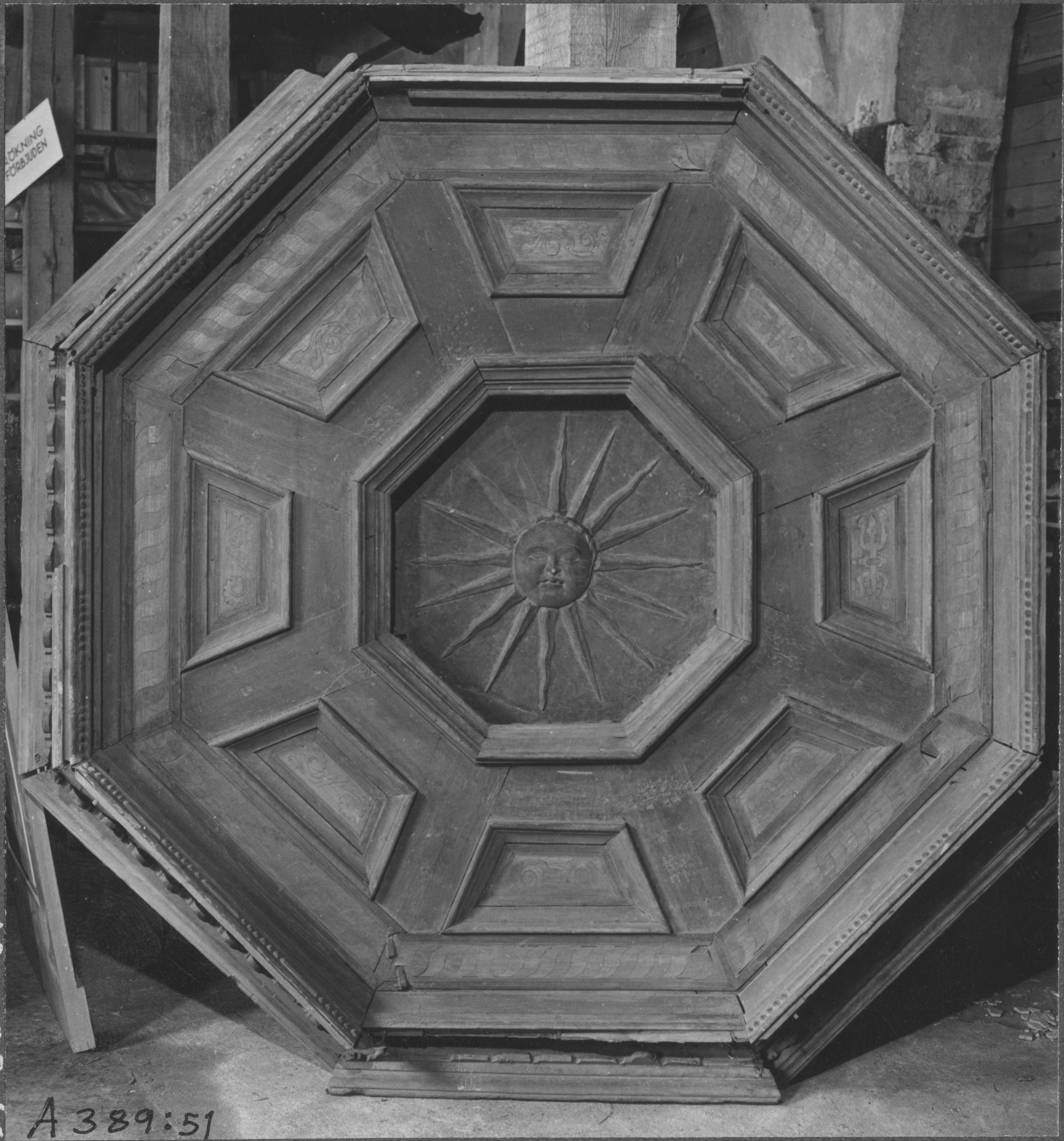 Beskrivning: Predikstolstak av ek. I mitten skulpterad sol. Från 1600-talets andra hälft.