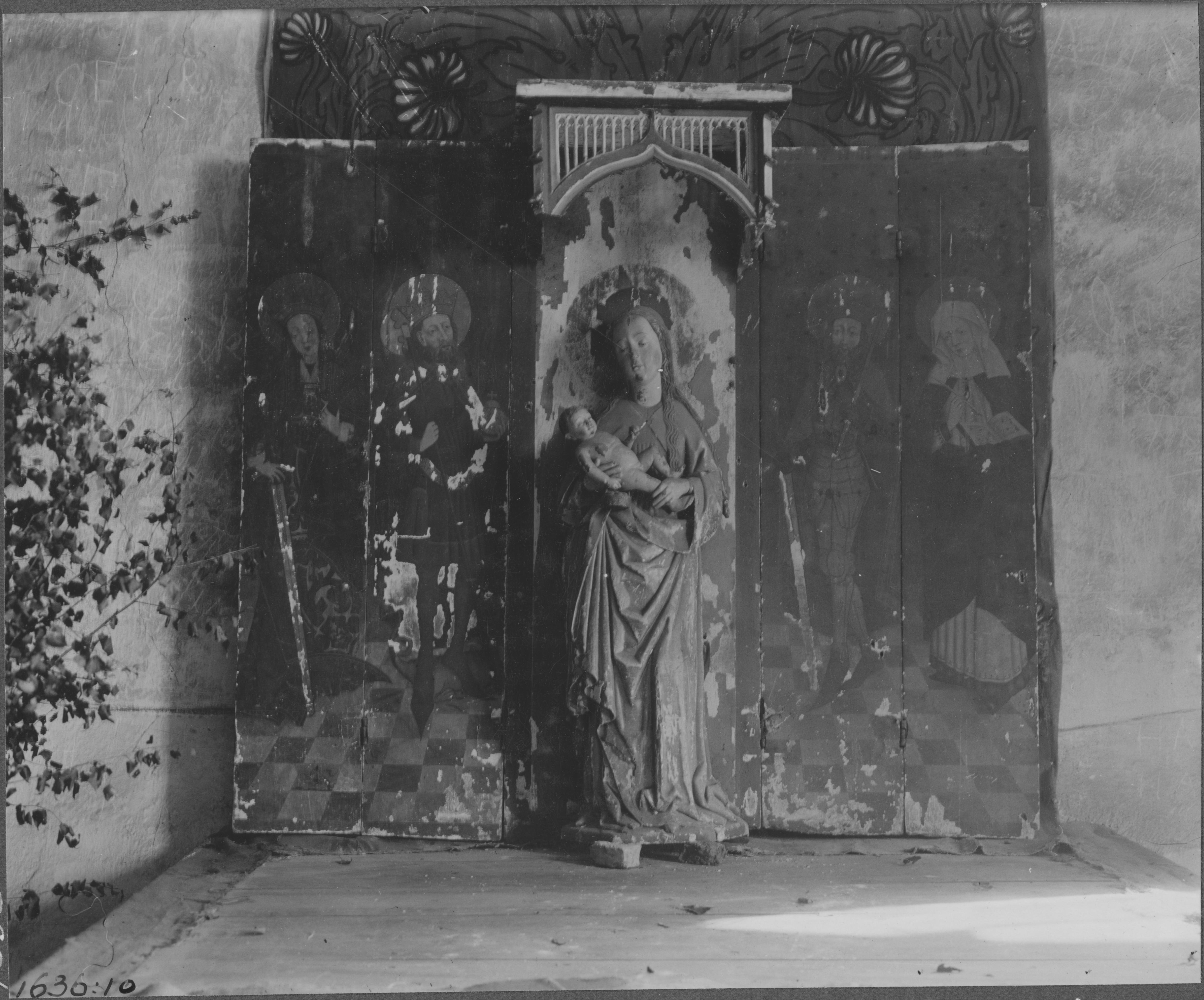 Beskrivning: Altarskåp, Mariaaltarskåp av trä. I corpus Madonnan, skulpterad, krederad och målad, hållande Jesusbarnet. Flyglarna med målade helgonfigurer. 1400-talets slut. Snabbinventering.