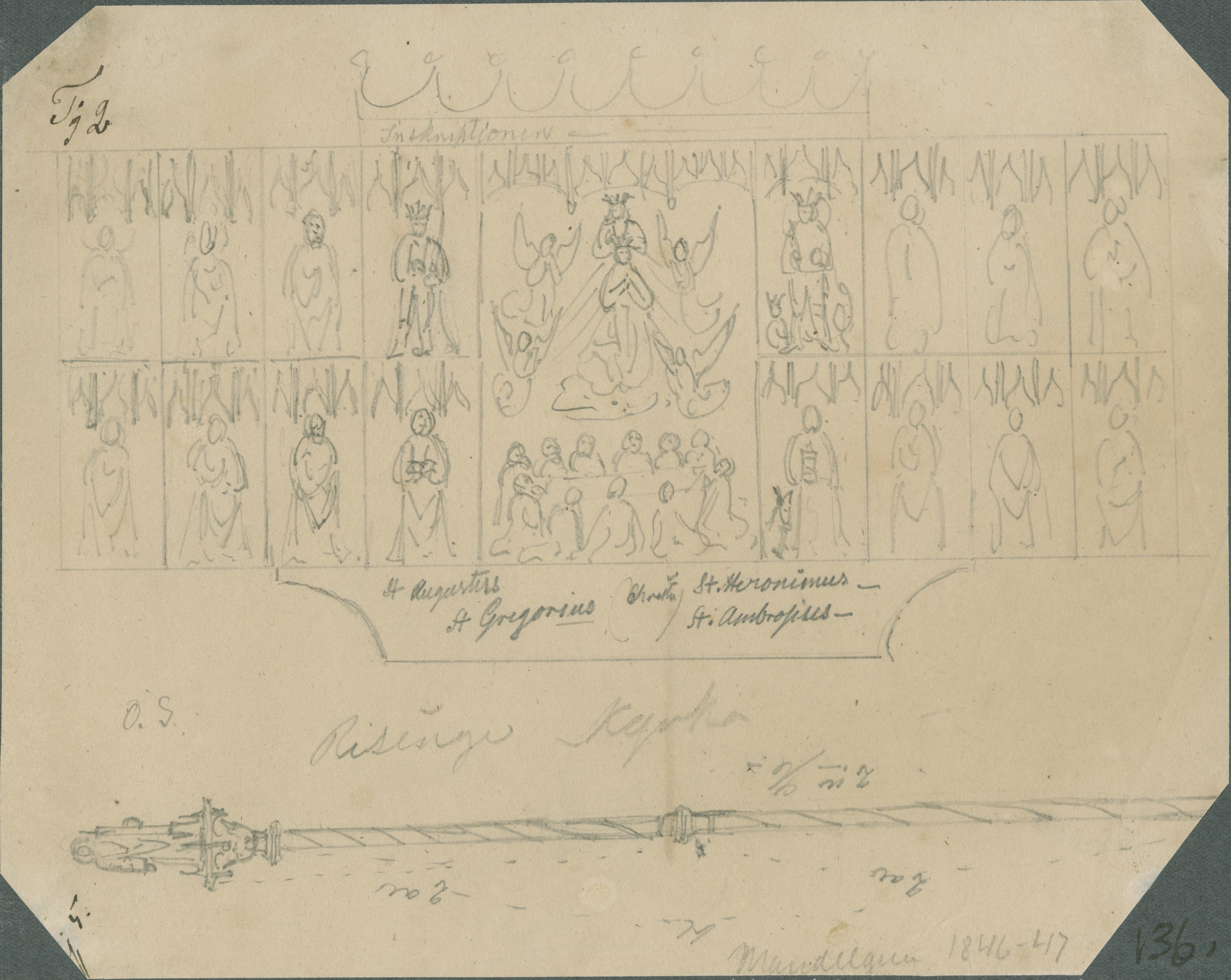 Beskrivning: Altarskåp, Mariaaltarskåp av trä. I corpus Madonnan, skulpterad, krederad och målad, hållande Jesusbarnet. Flyglarna med målade helgonfigurer. 1400-talets slut. Liggande: Processionsstav av trä. Ritning av Mandelgren 1846-1847.