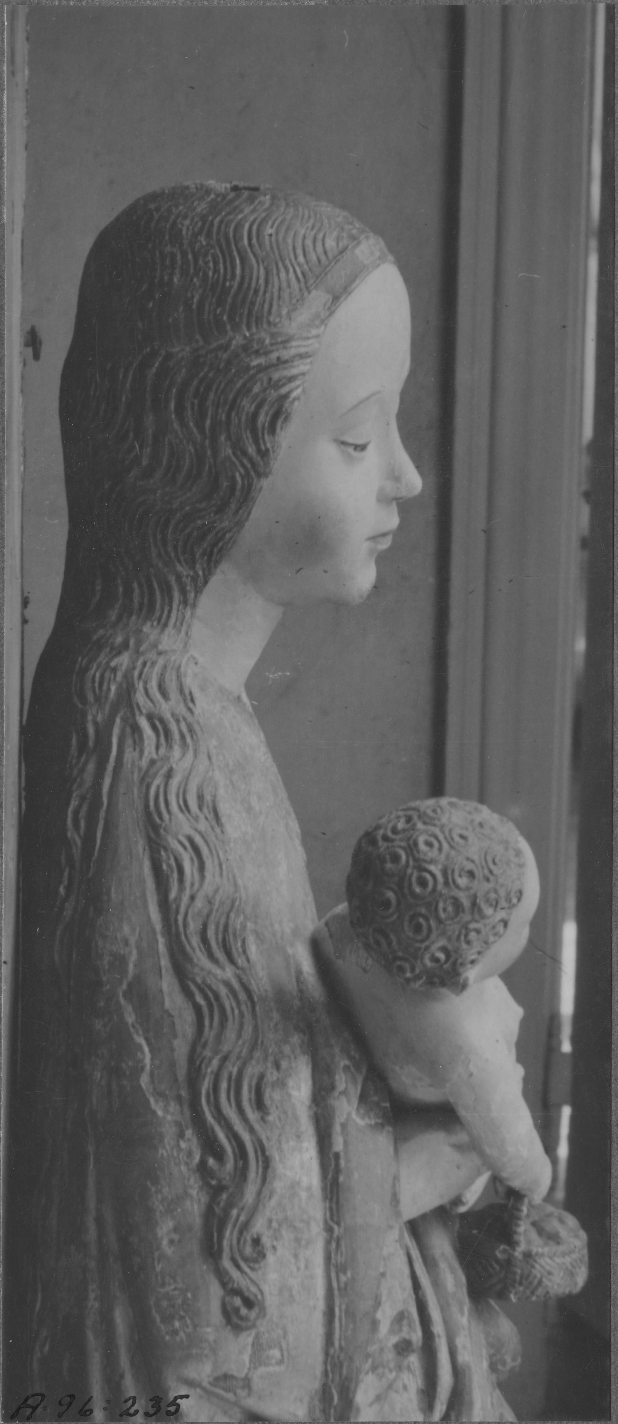 Beskrivning: Altarskåp, Mariaaltarskåp av trä. I corpus Madonnan, skulpterad, krederad och målad, hållande Jesusbarnet. Detalj. 1400-talets slut. Efter konservering 1945.