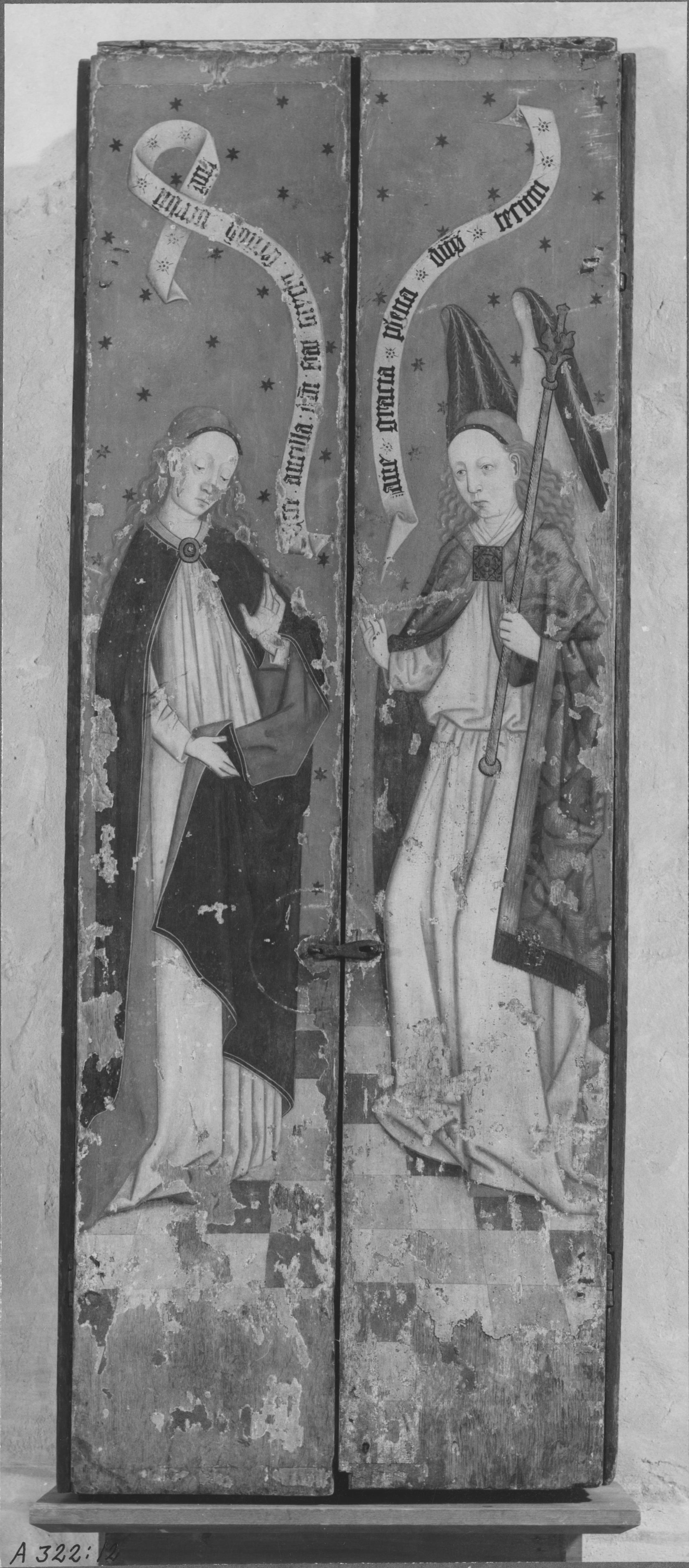 Beskrivning: Altarskåp, Mariaaltarskåp av trä. Dörrarna. 1400-talets slut. Efter konservering 1945.