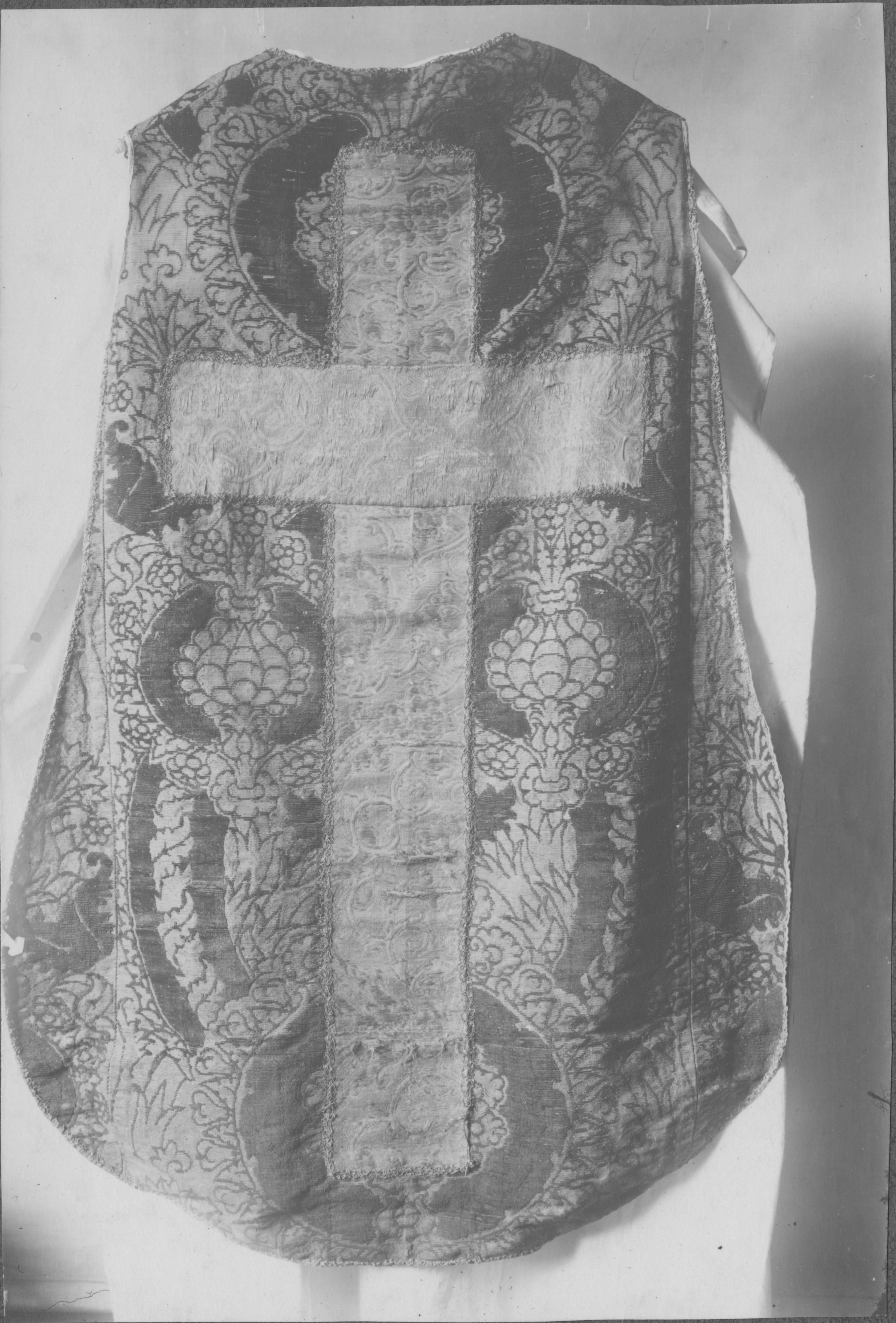 Beskrivning: Mässhake av sammetsbrokad på guldfärgad botten. Ryggstycket. Från 1400-talet. Före renovering.
