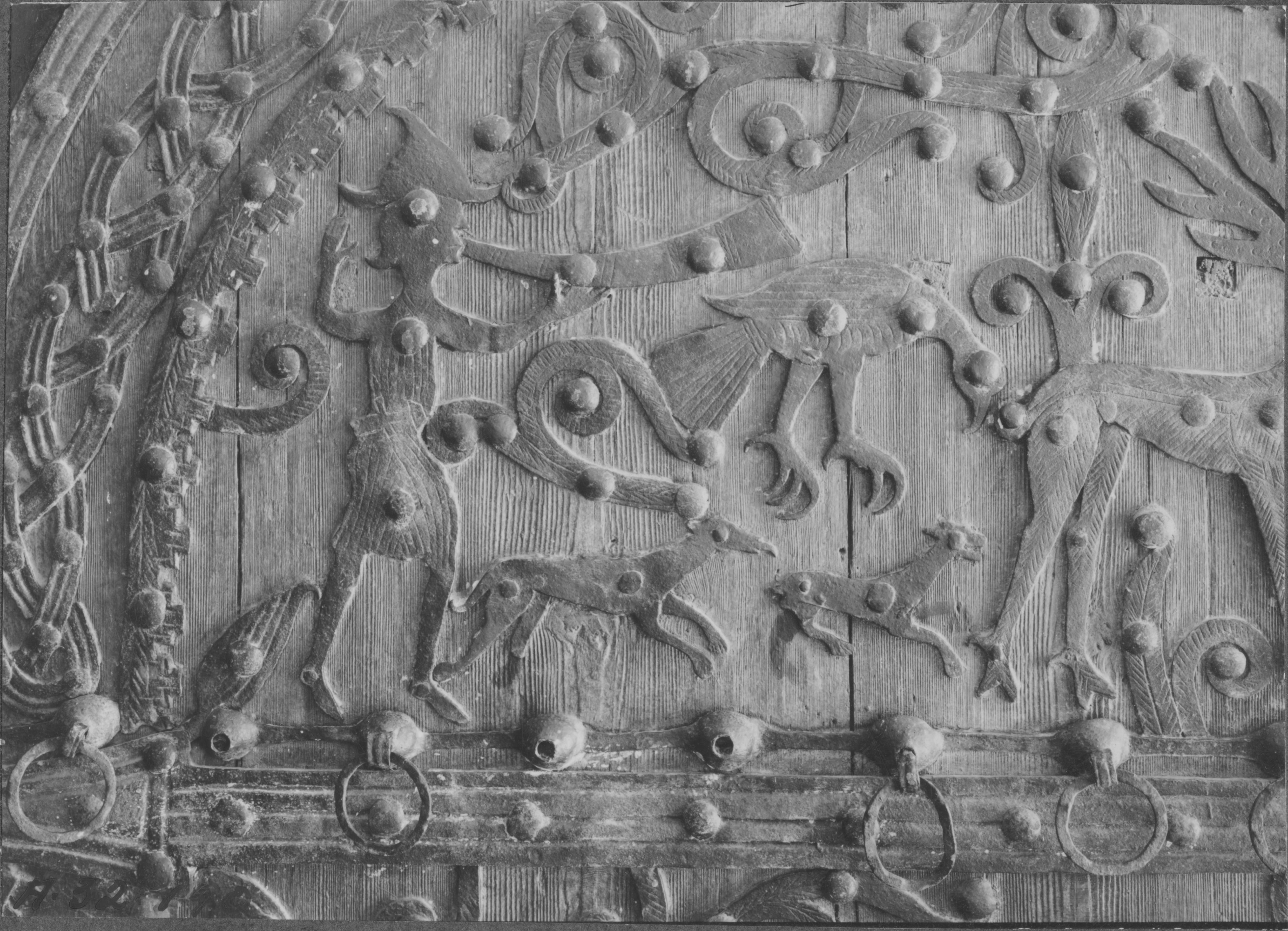 Beskrivning: Anmärkning (övrig): Foto från 1930-talet. Beskrivning: Sydportalen, Rogslösadörren, en medeltida järnbeslagen trädörr med figurframställningar. Dendrodaterad till 1275. Detalj. Kyrkans huvudingång.