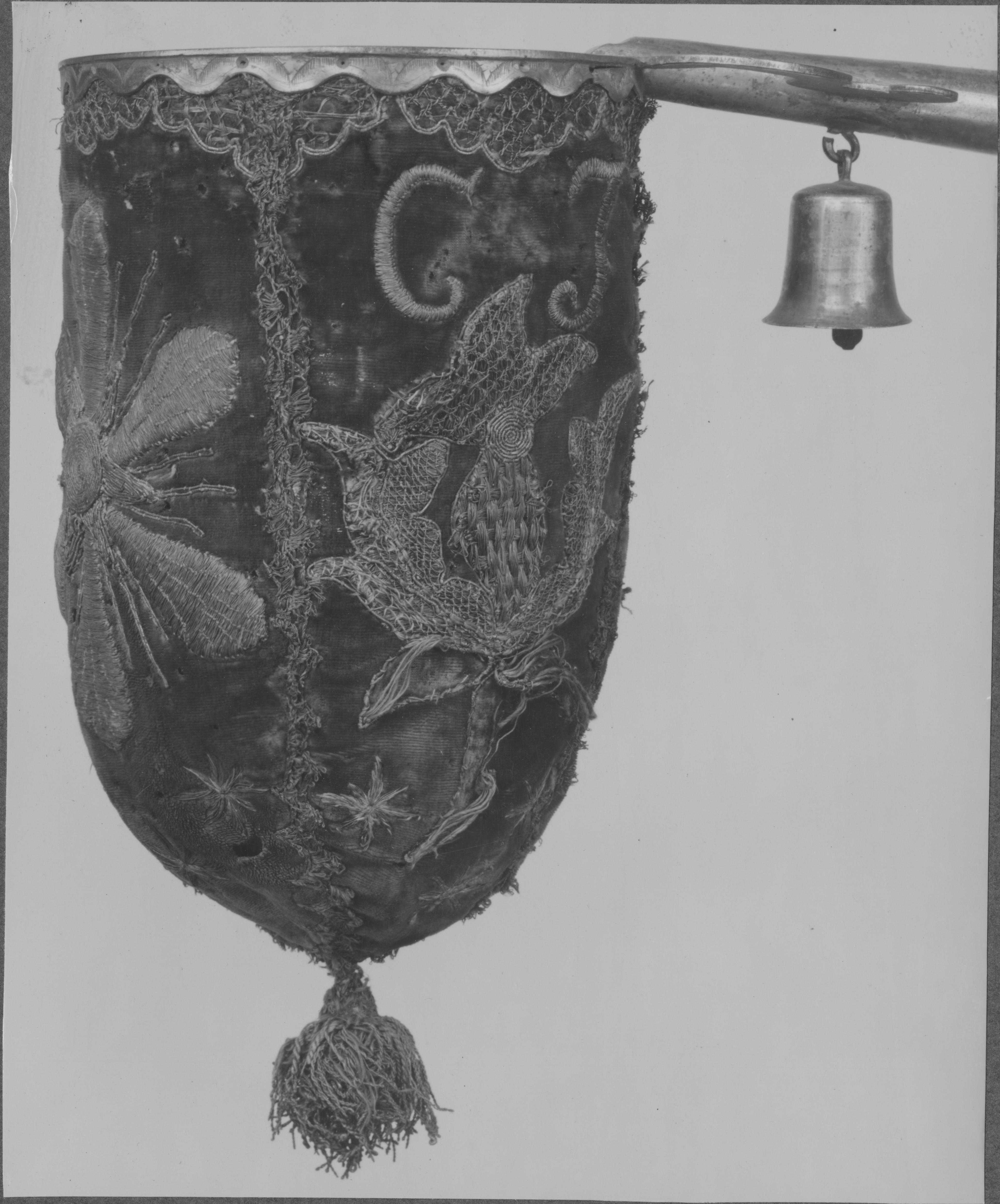 Beskrivning: Håv av röd sammet med silverbroderier, blommor och inskrift Z.T. C.T. 1754. Förgyllt beslag, skaft av björk. Deponerad i Nordiska Museet.