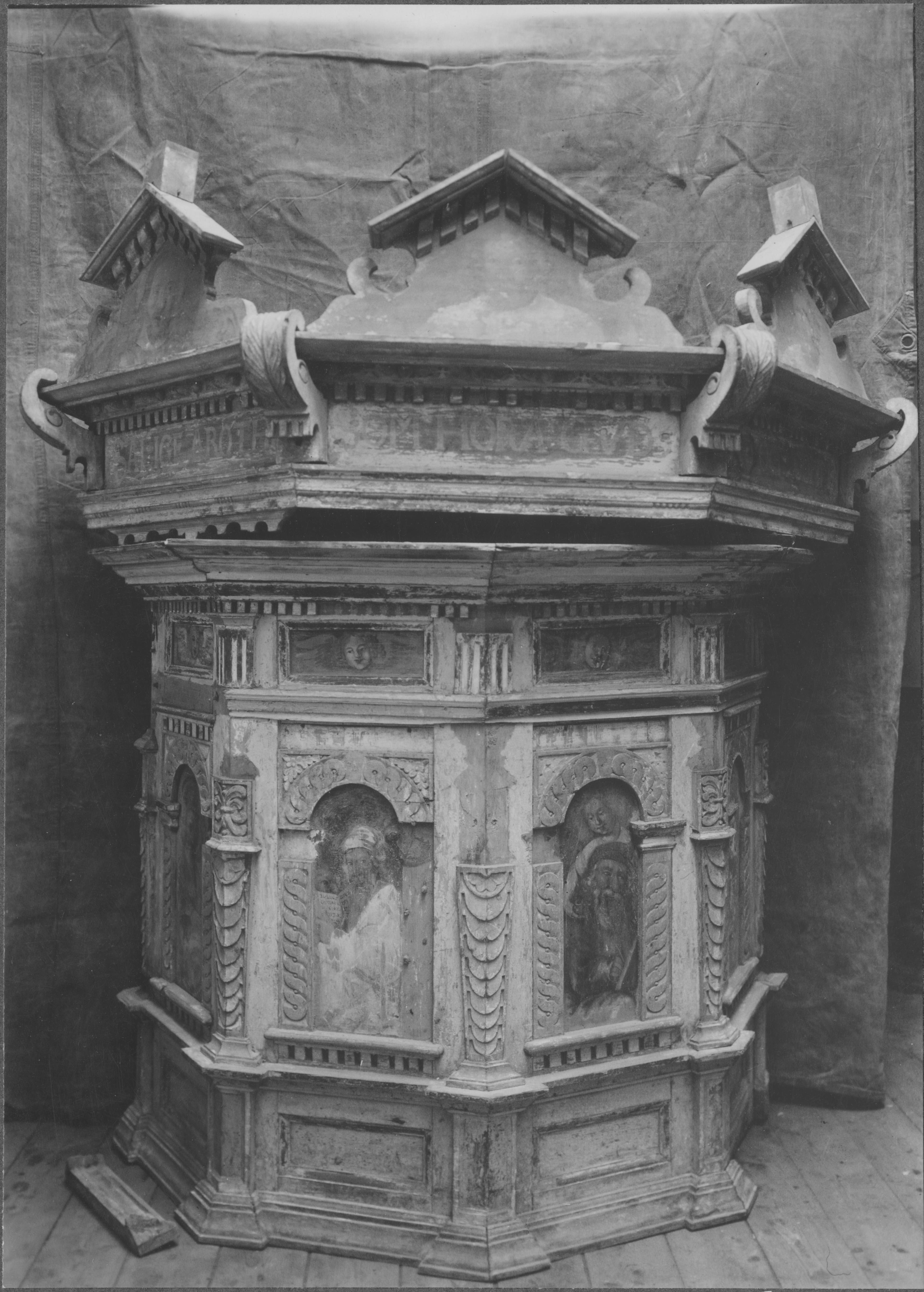Beskrivning: Predikstol av trä, skulpterad. fyrasidig. Evangelisterna målade, står i förgyllda bågställningar. Från 1645. Före restaurering 1937.