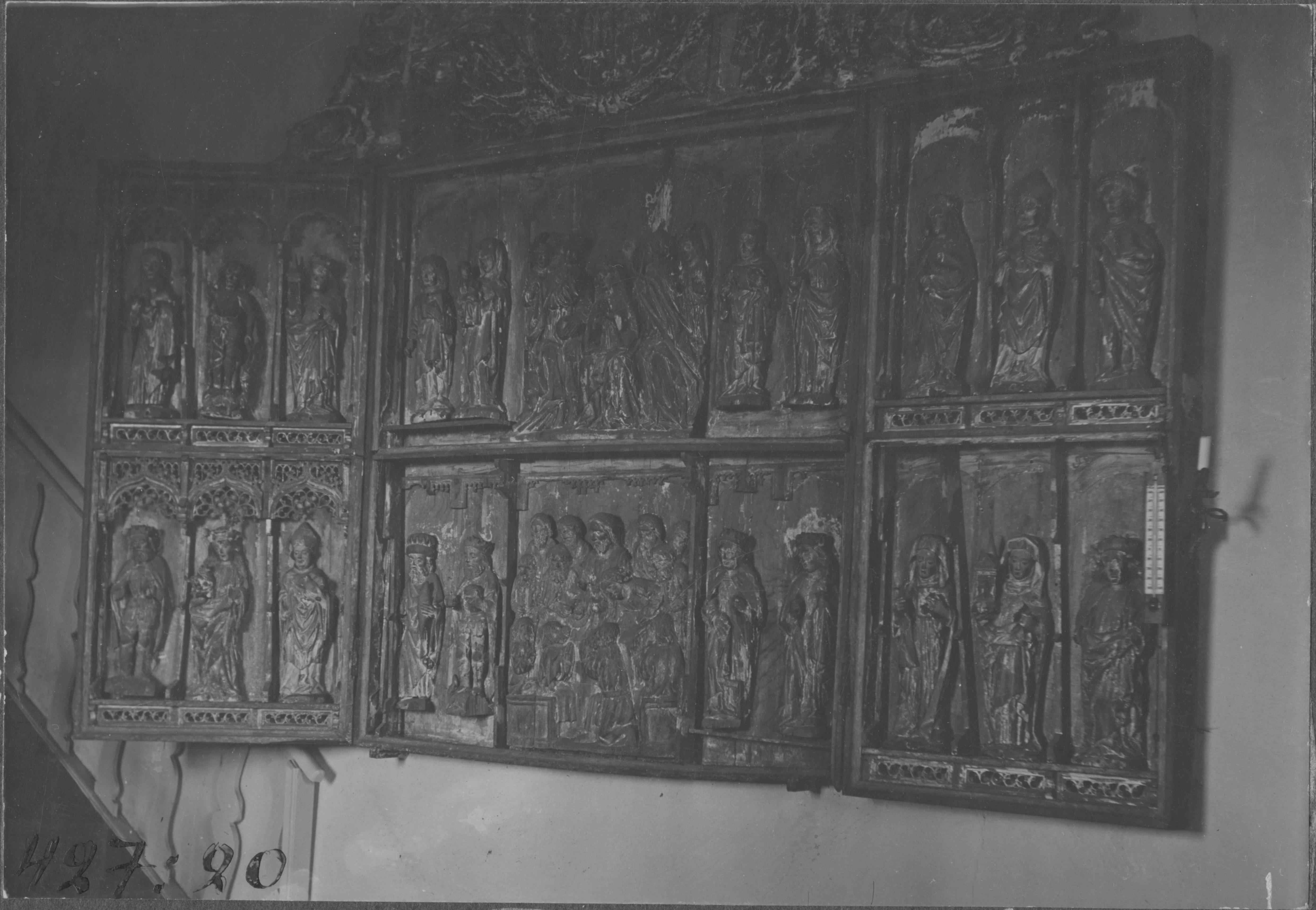 Beskrivning: Altarskåp med skulpterade figurer i corpus och flyglarna. I corpus Marias kröning och nattvarden samt helgon. I flyglarna helgon. Defekt i corpus och högra flygeln. 1400-talets slut.