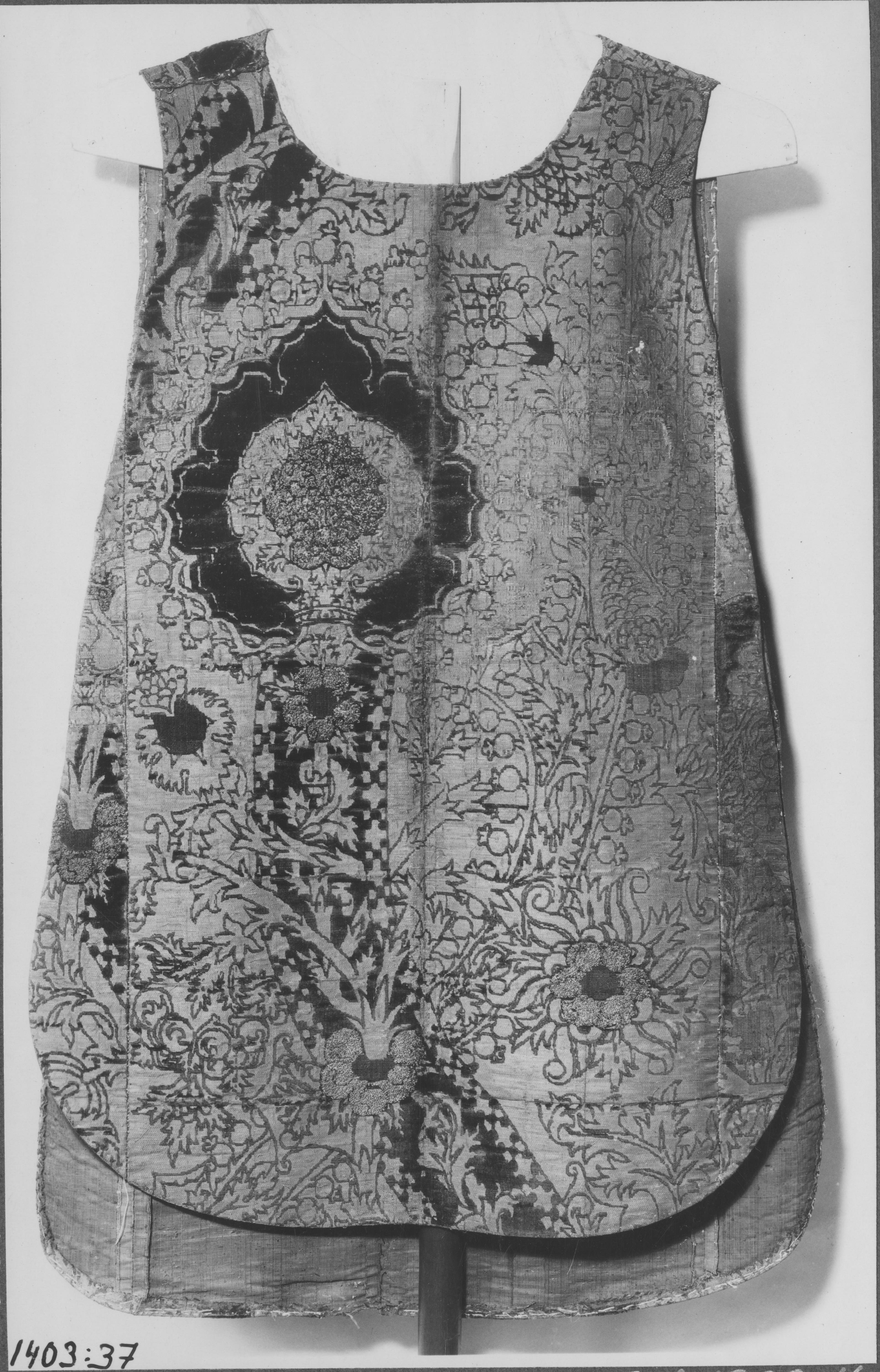 Beskrivning: Mässhake av sammetsbrokad, hör samman med membranguldsbrokadfoder. Bröststycket. Senmedeltid.