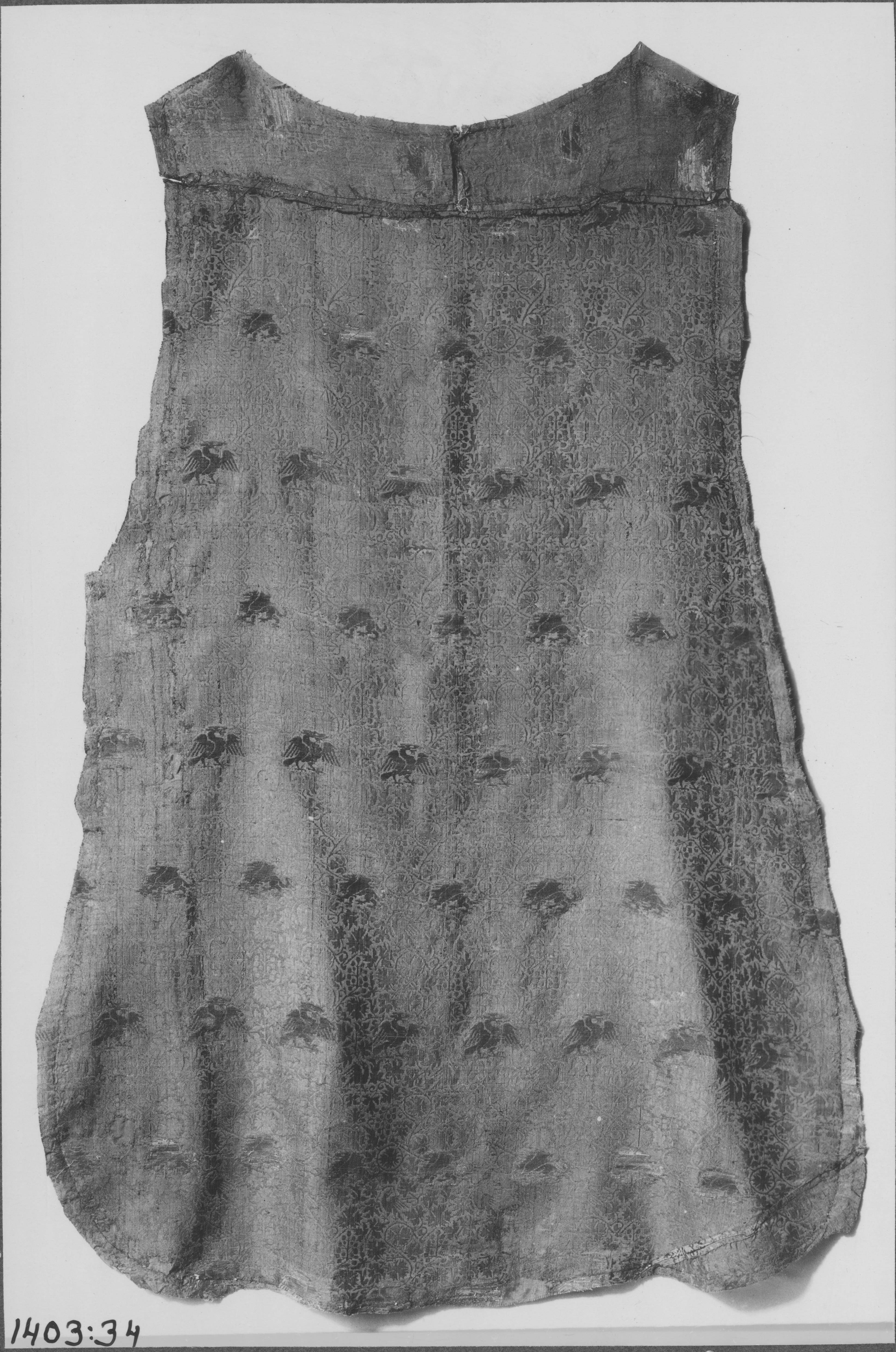 Beskrivning: Mässhake av diaspersiden med grön botten och rödviolett vinrankmönster med fåglar i, inbroscherade fåglar och gripar i membranguld, italienskt. Ryggstycket. Högmedeltid.