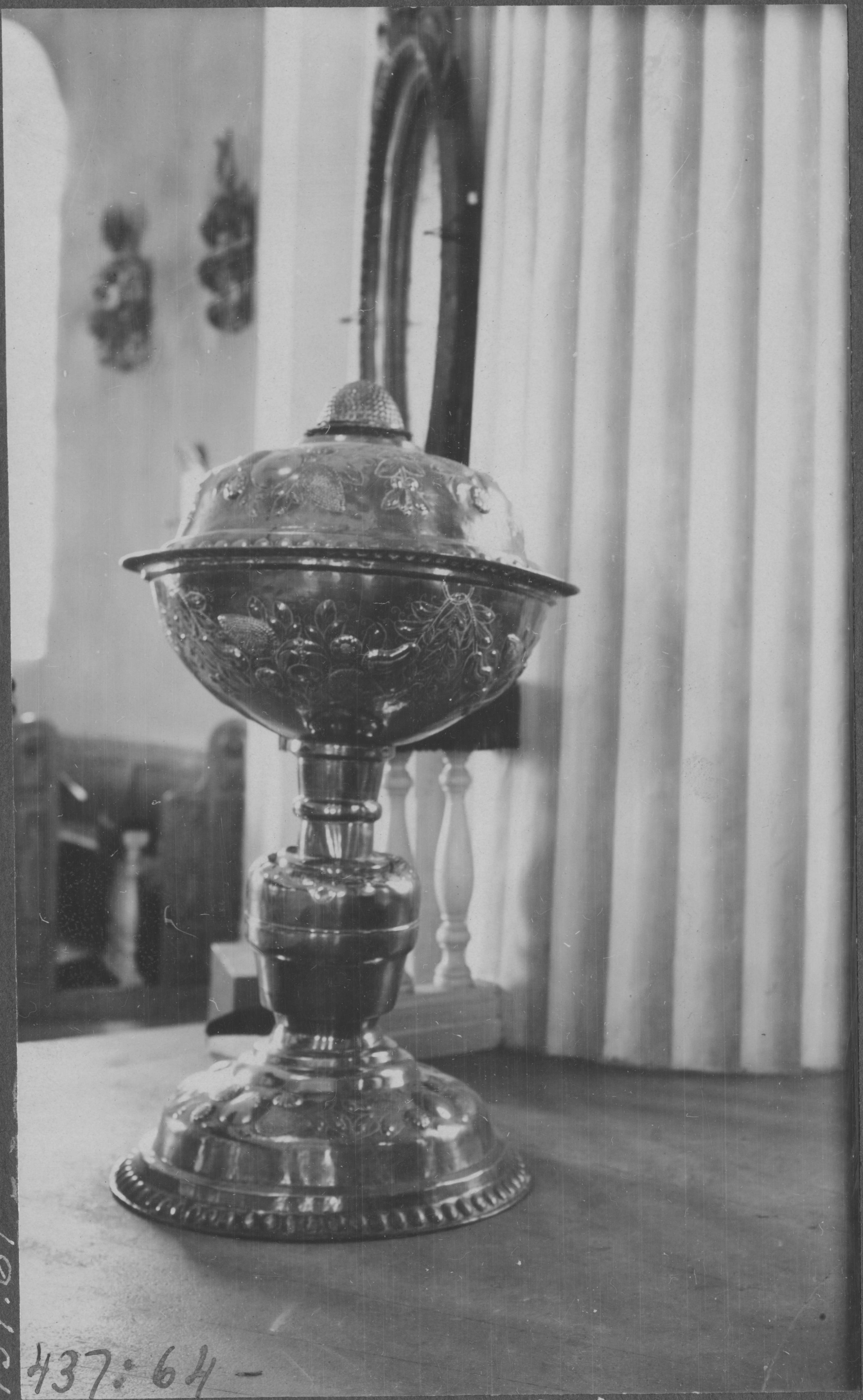 Beskrivning: Dopfunt av mässing, rikt ornerad. Skänkt 1701 av ägarna till socknens större gårdar.