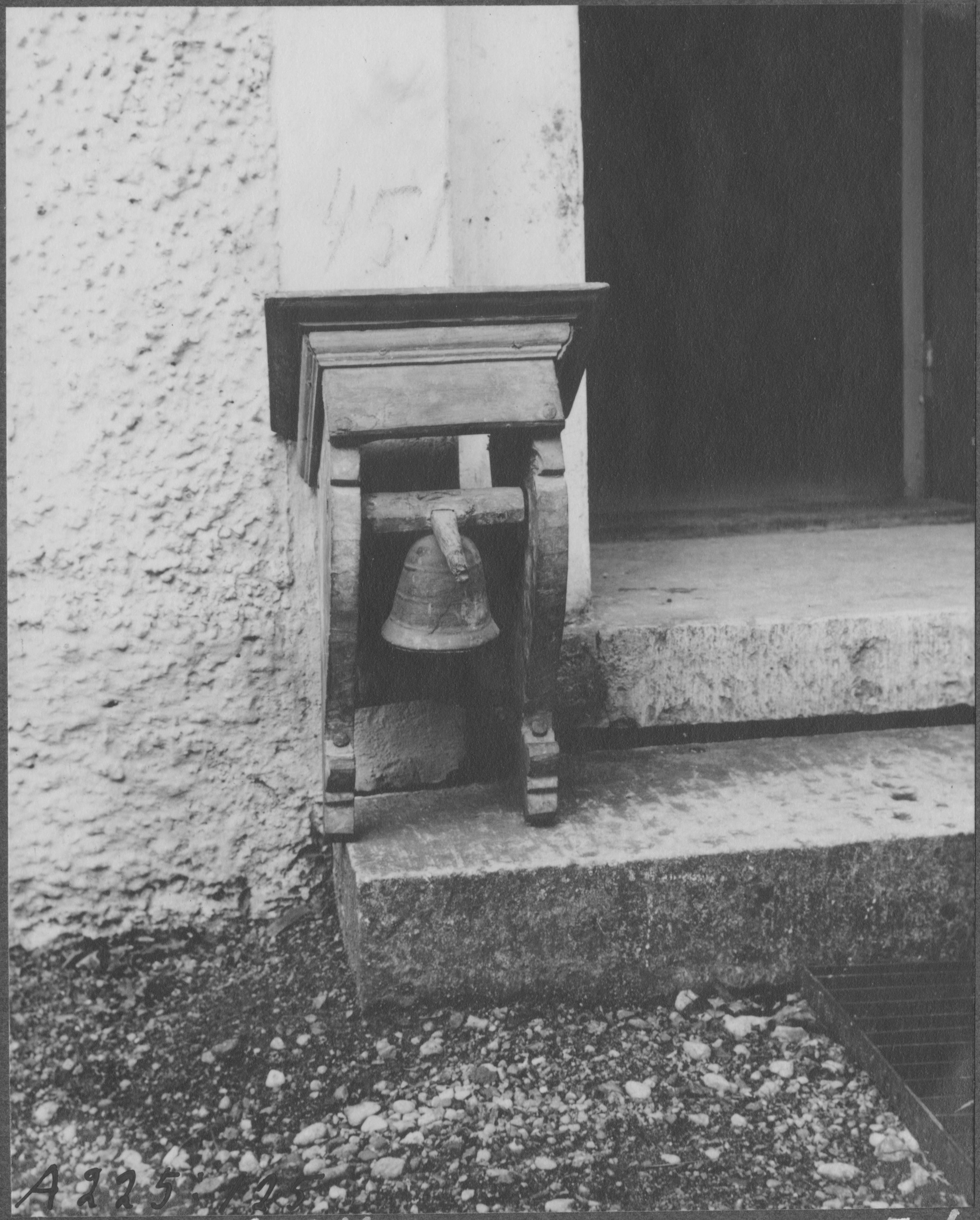 Beskrivning: Sanctusklocka av malm, insatt i ett litet tresidigt skjul av trä med profilerade sidor. Medeltida.