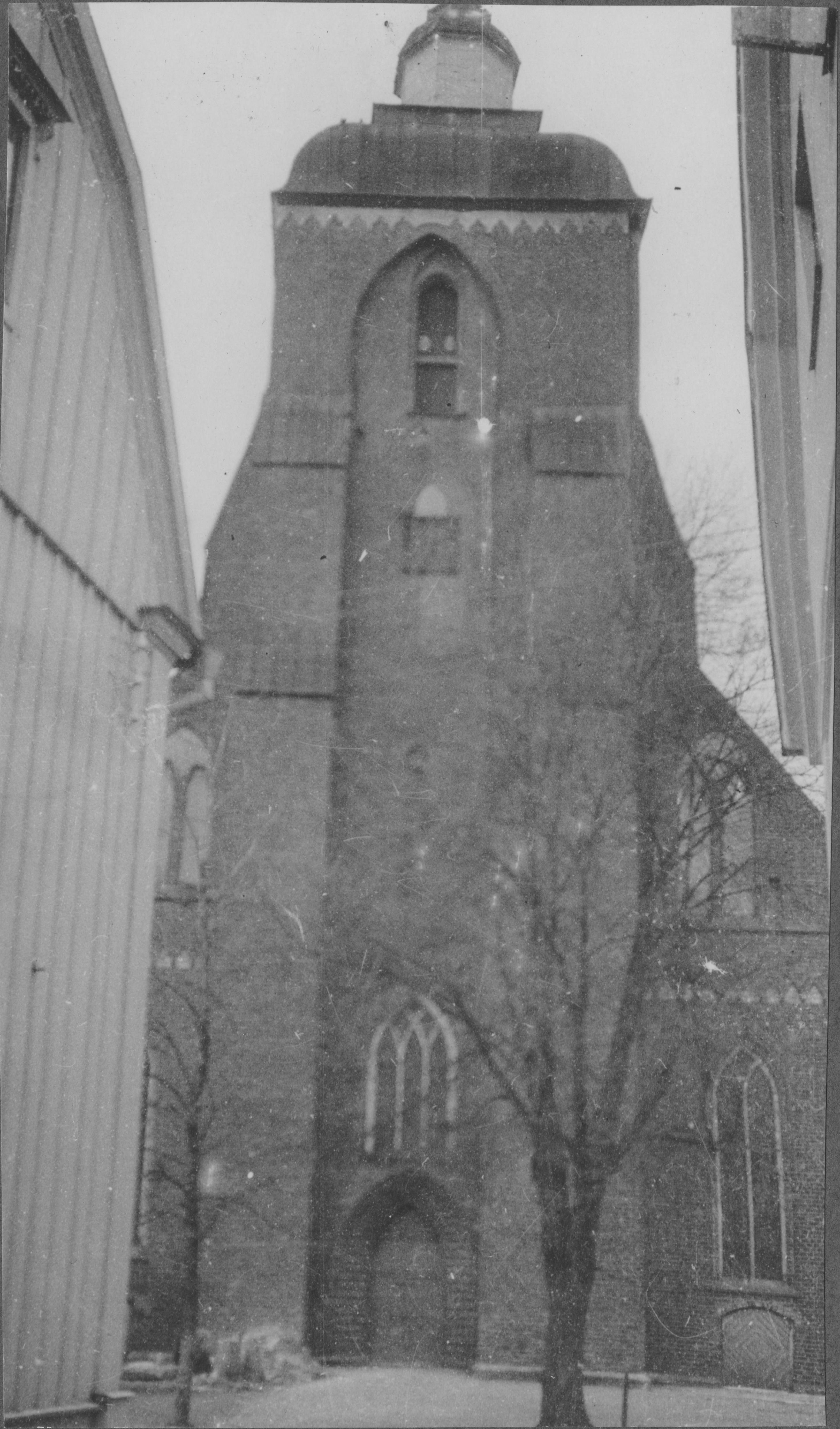 Beskrivning: Kyrktornet med huvudingången. Från väster.
