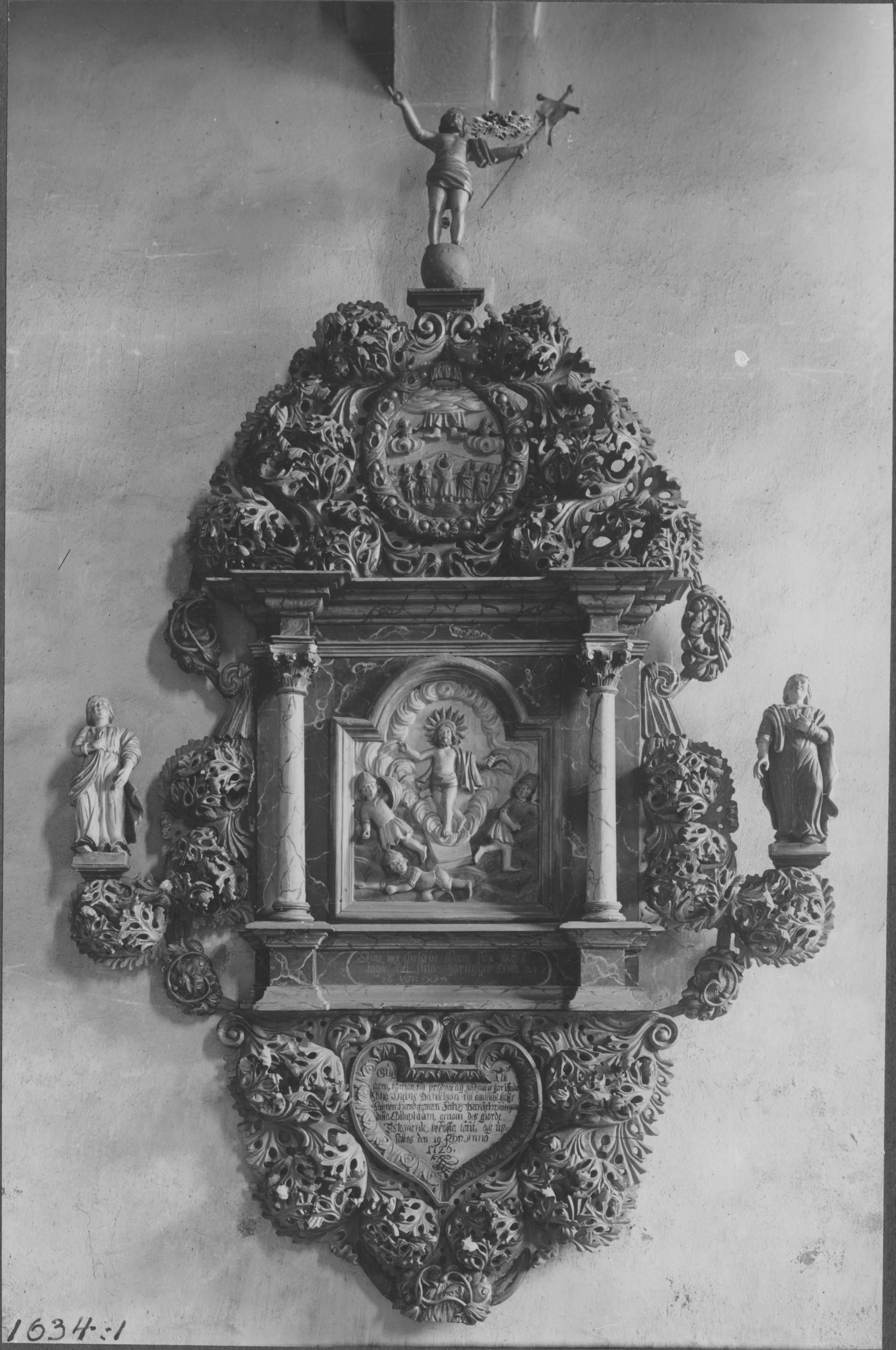 Beskrivning: Epitafium över Måns Danielsson, 1726. Snidat och målat trä. I mitten relief med Kristi uppståndelse, arkitektoniskt omramad. Hjärtformigt inskriftsfält nedtill. Snabbinventering.