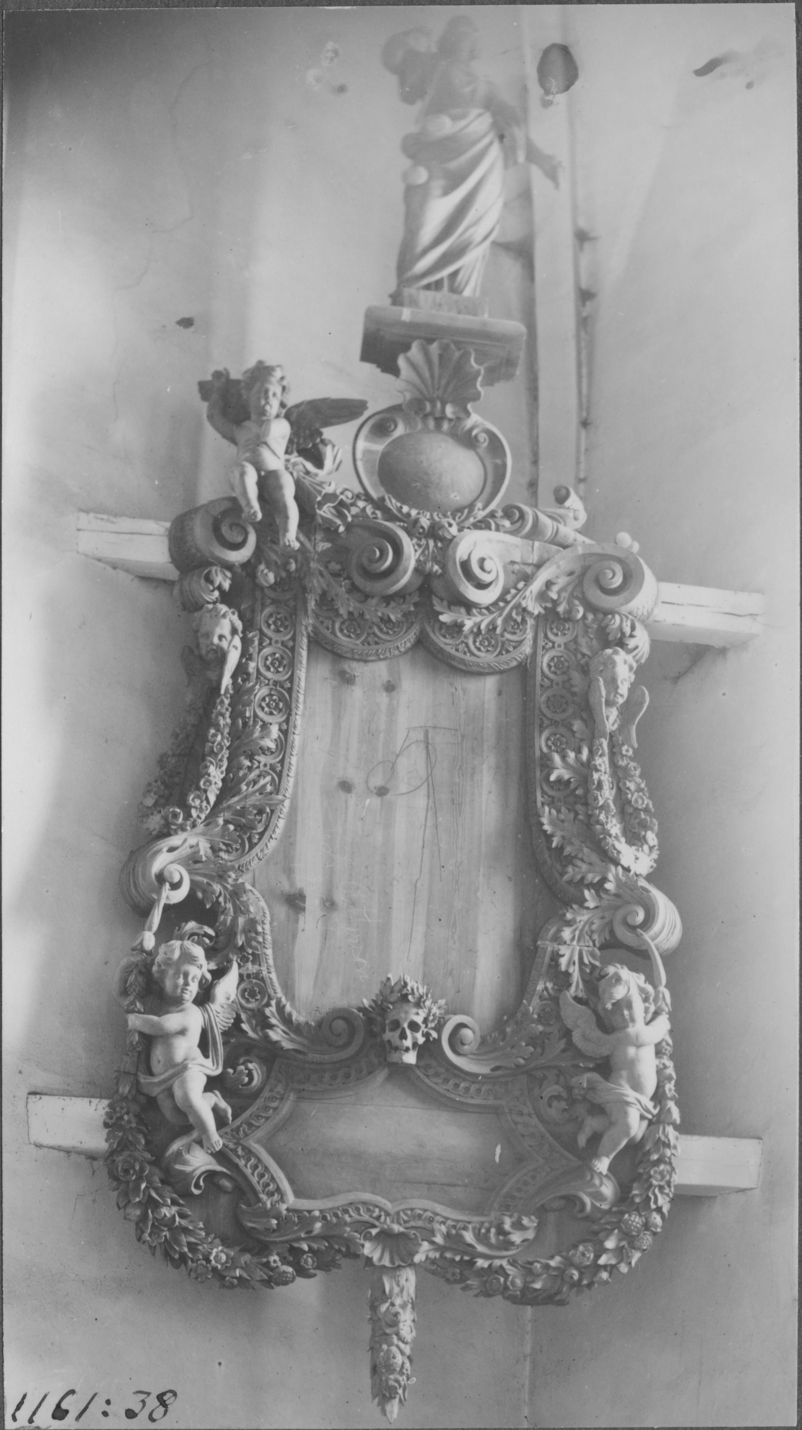 Beskrivning: Epitafium av snidat trä, omålat, ofullbordat. Sköldformigt mittfält ett mindre fält nedtill. Som krön en Justitia i friskulptur. Omkring 1700.