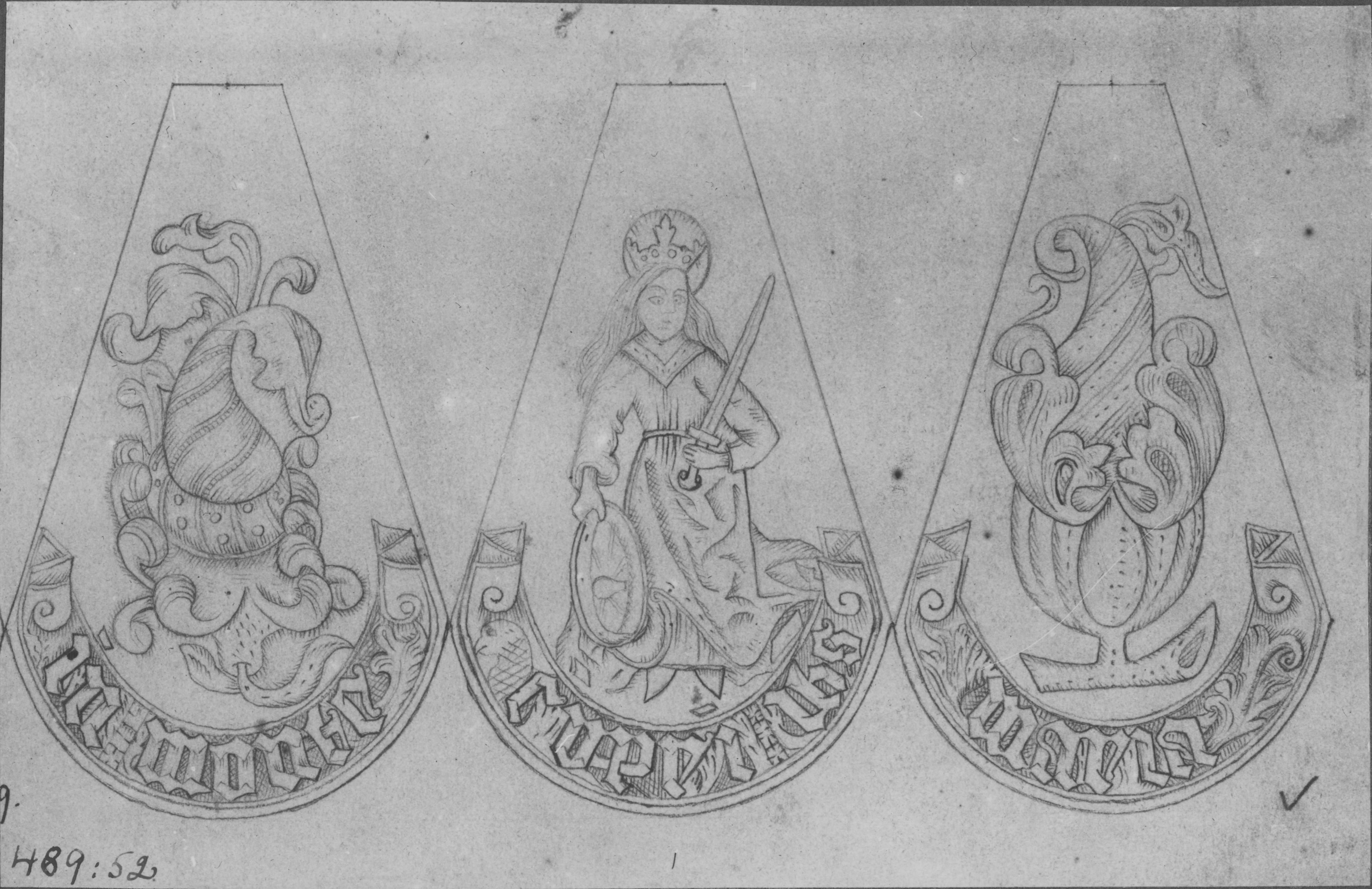 Beskrivning: Kalk av silver, förgylld. Sexpassformad fot med fastskruvat krucifix, graveringar av S:t Göran, Katarina av Alexandria och Johannes evangelisten växlande med sengotiska blommor. Ornerat nod. Detralj. Teckning. Svenskt arbete, omkring 1500.