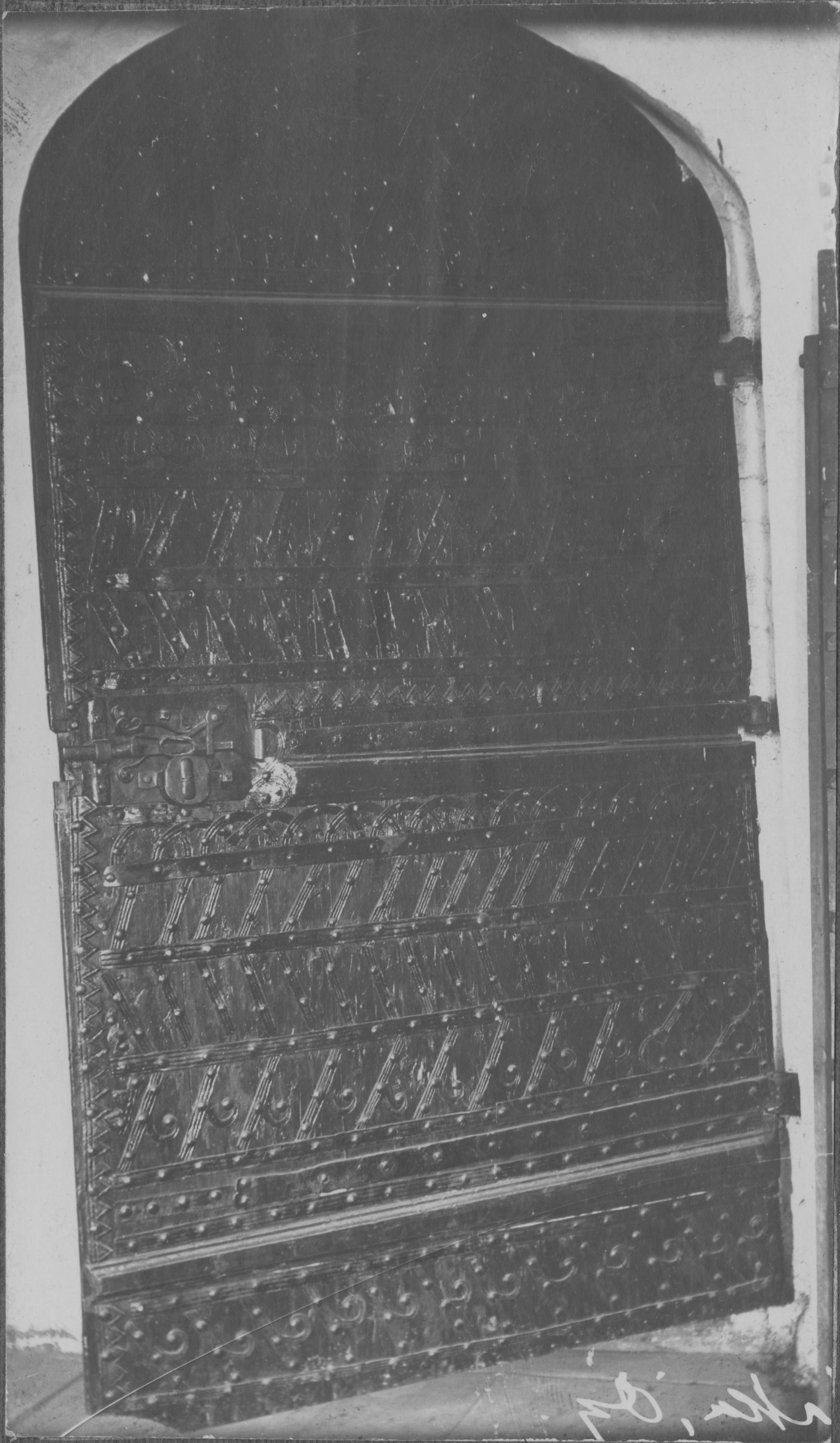 Beskrivning: Dörr, romansk järnbeslagen. Sakristian, mot kyrkorummet.