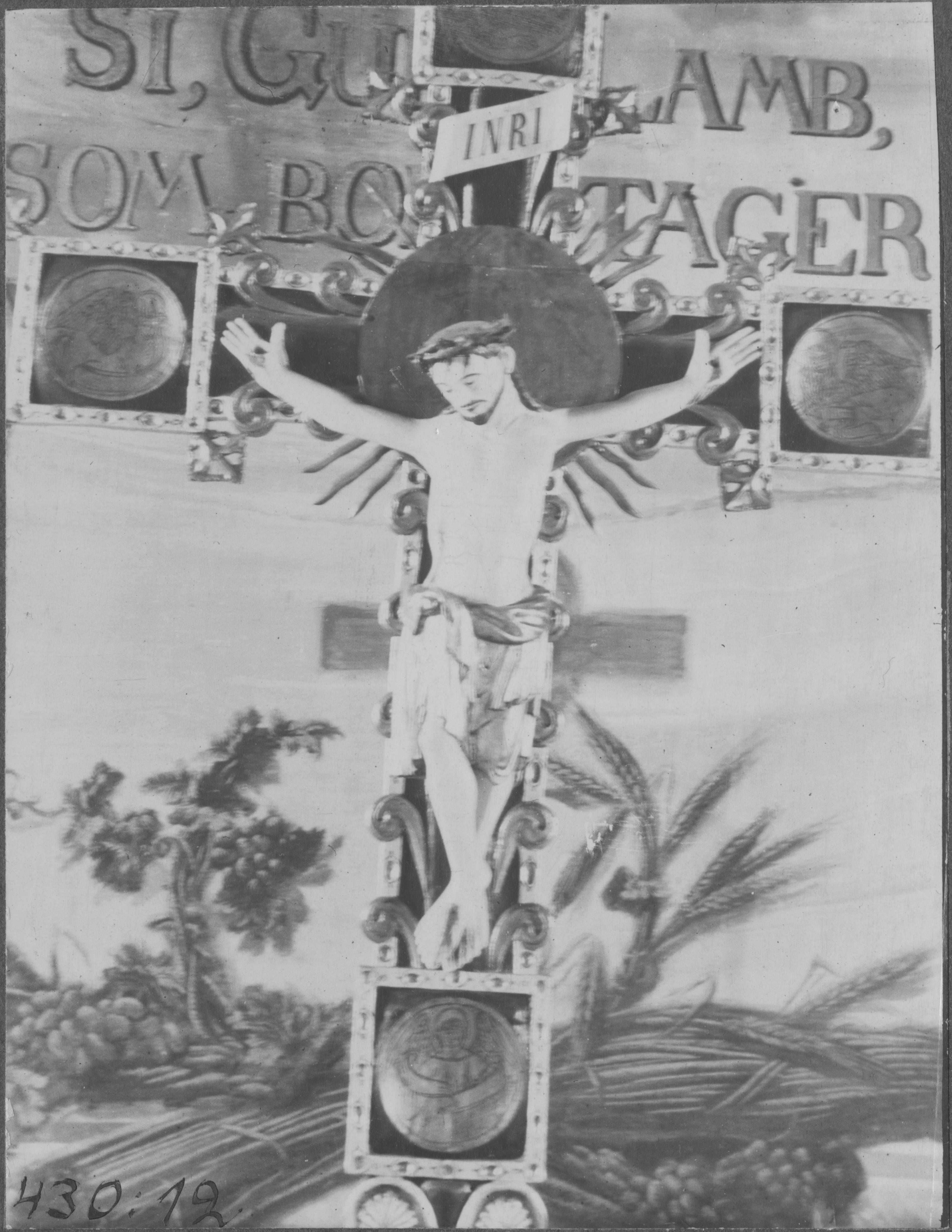 Beskrivning: Triumfkrucifix av trä. Kristussbild av sen 1200-talstyp med törnekrona av trä. Rikt ornerat kors med gloria i korsarmarna och evangelistsymboler i de fyra ändarna.