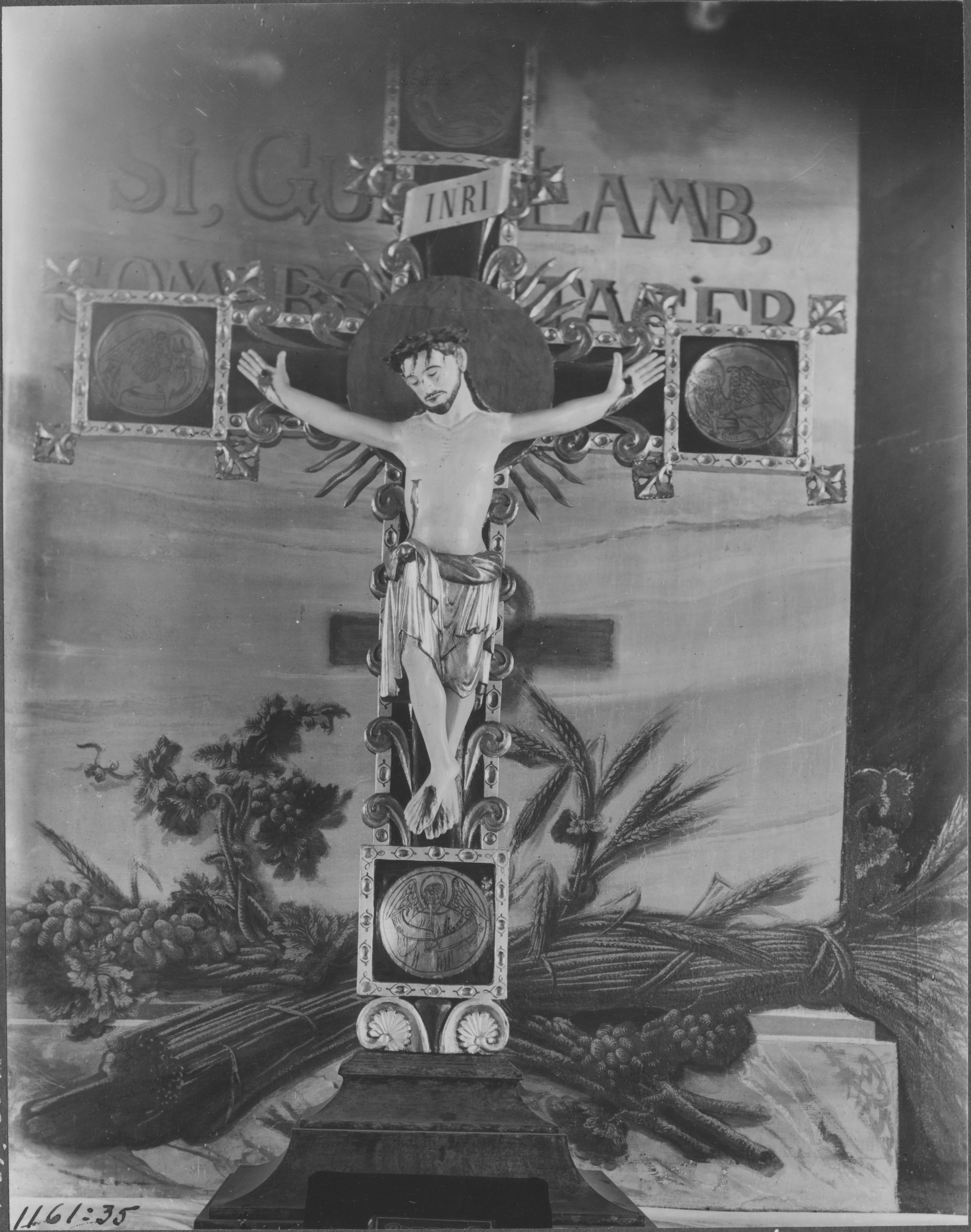 Beskrivning: Triumfkrucifix av trä. Kristussbild av sen 1200-talstyp med törnekrona av trä. Rikt ornerat kors med gloria i korsarmarna och evangelistsymboler i de fyra ändarna.