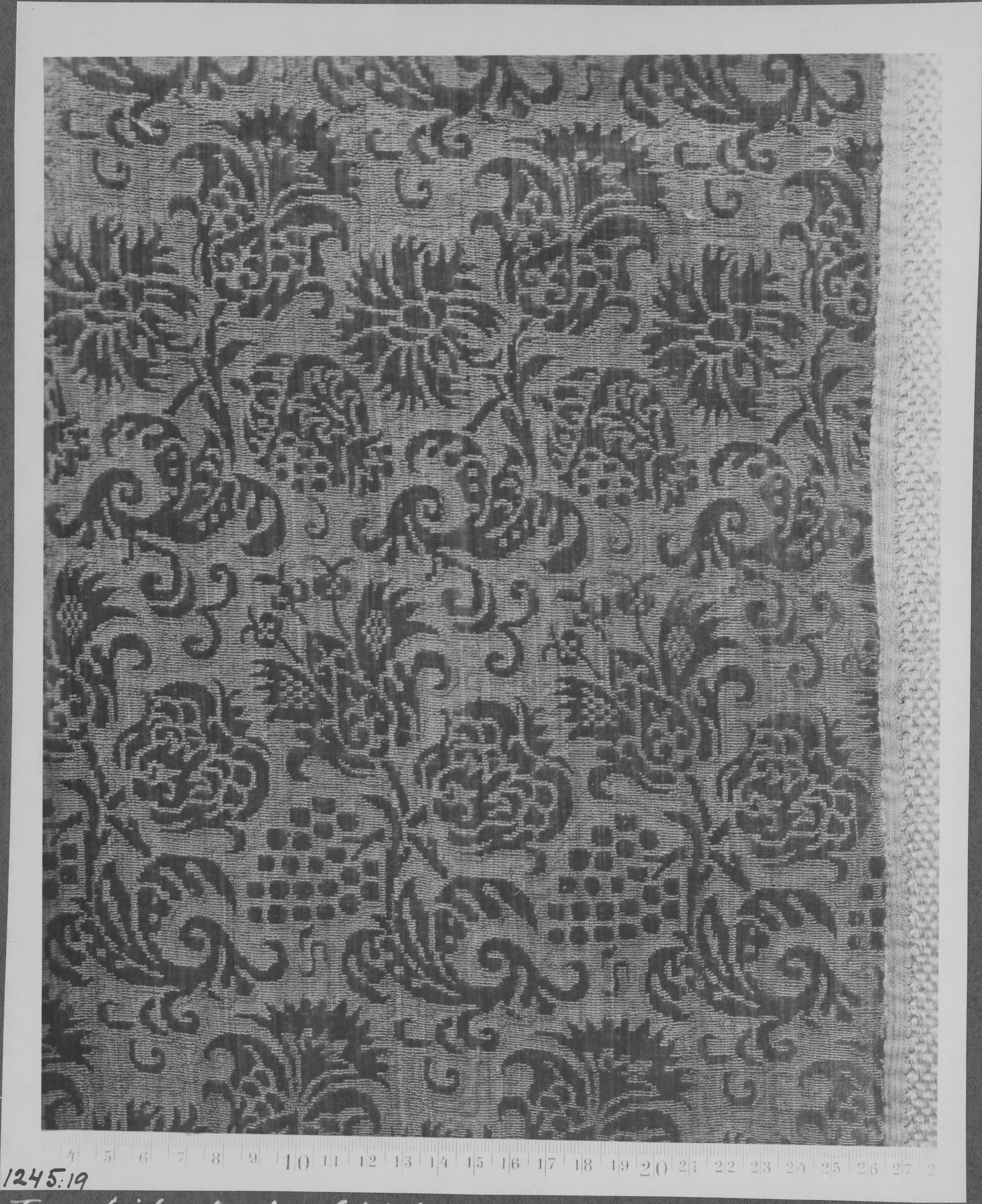 Beskrivning: Mässhake av grön sammet. Detalj. Medeltidens slut. Textilutställning i Stockholm 1929.