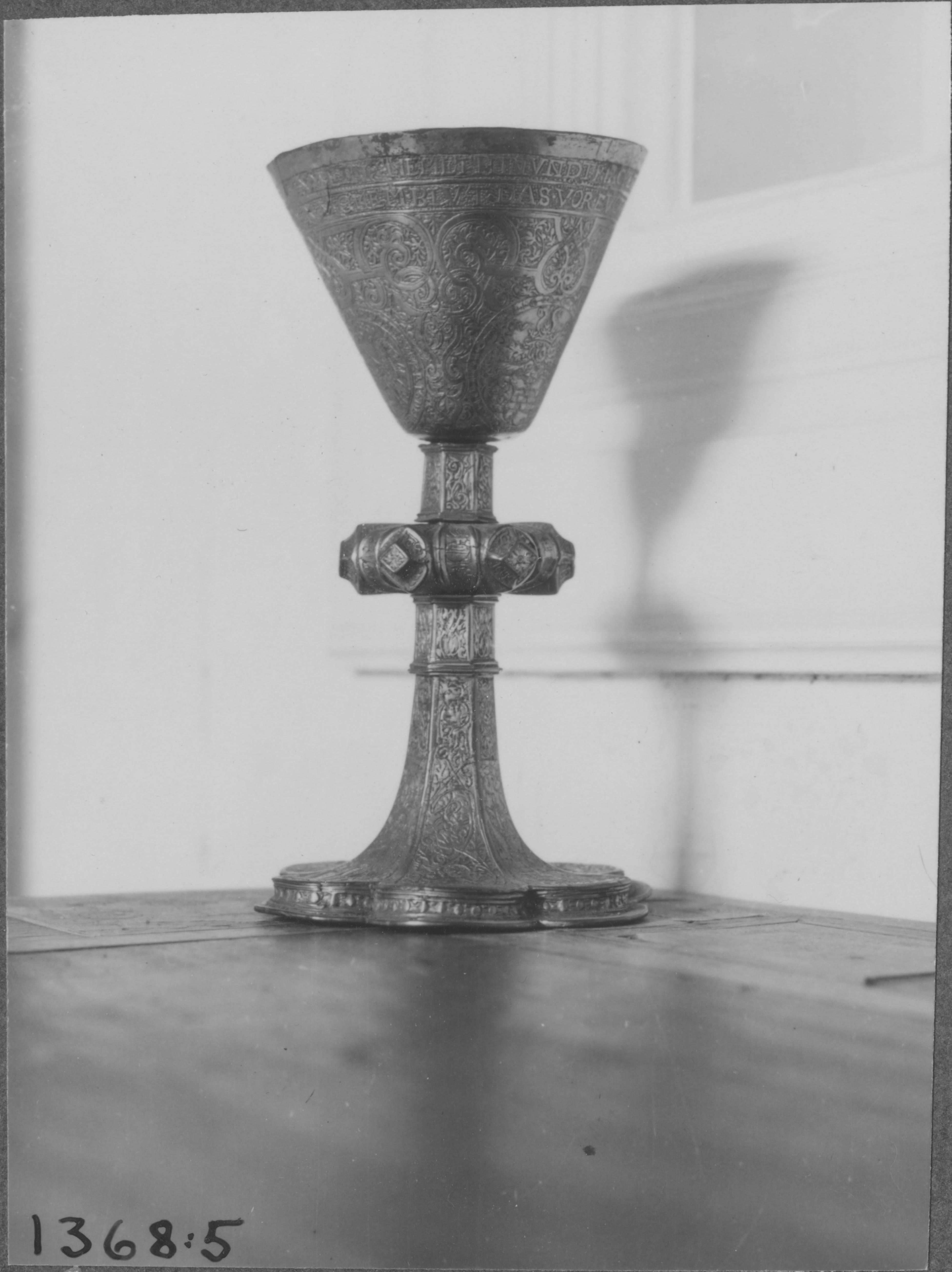 Beskrivning: Kalk av mässing med trattformad skål. Graverad med växter och figurer. Tysk inskription runt skålens kant upptill "1583". Snabbinventering.