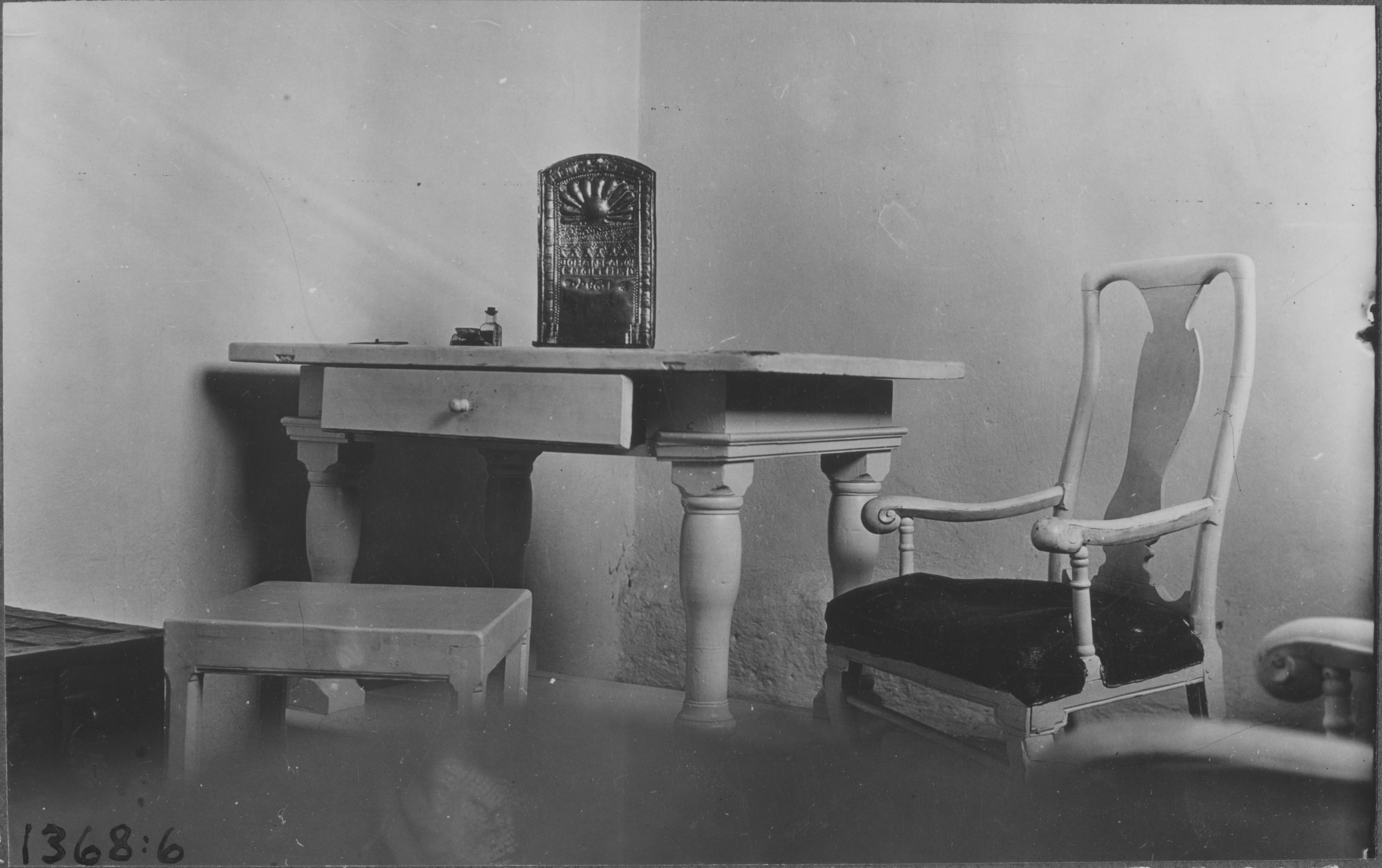 Beskrivning: Bord av trä, vitmålat. Skiva av furu. Fyra kolonnformade fötter. Omkring 1700. Länsstolar, två stycken, av björk och furu med stoppad sits. 1700-talets början. Taburett av ek, vitmålad. 1600-talet? Snabbinventering.