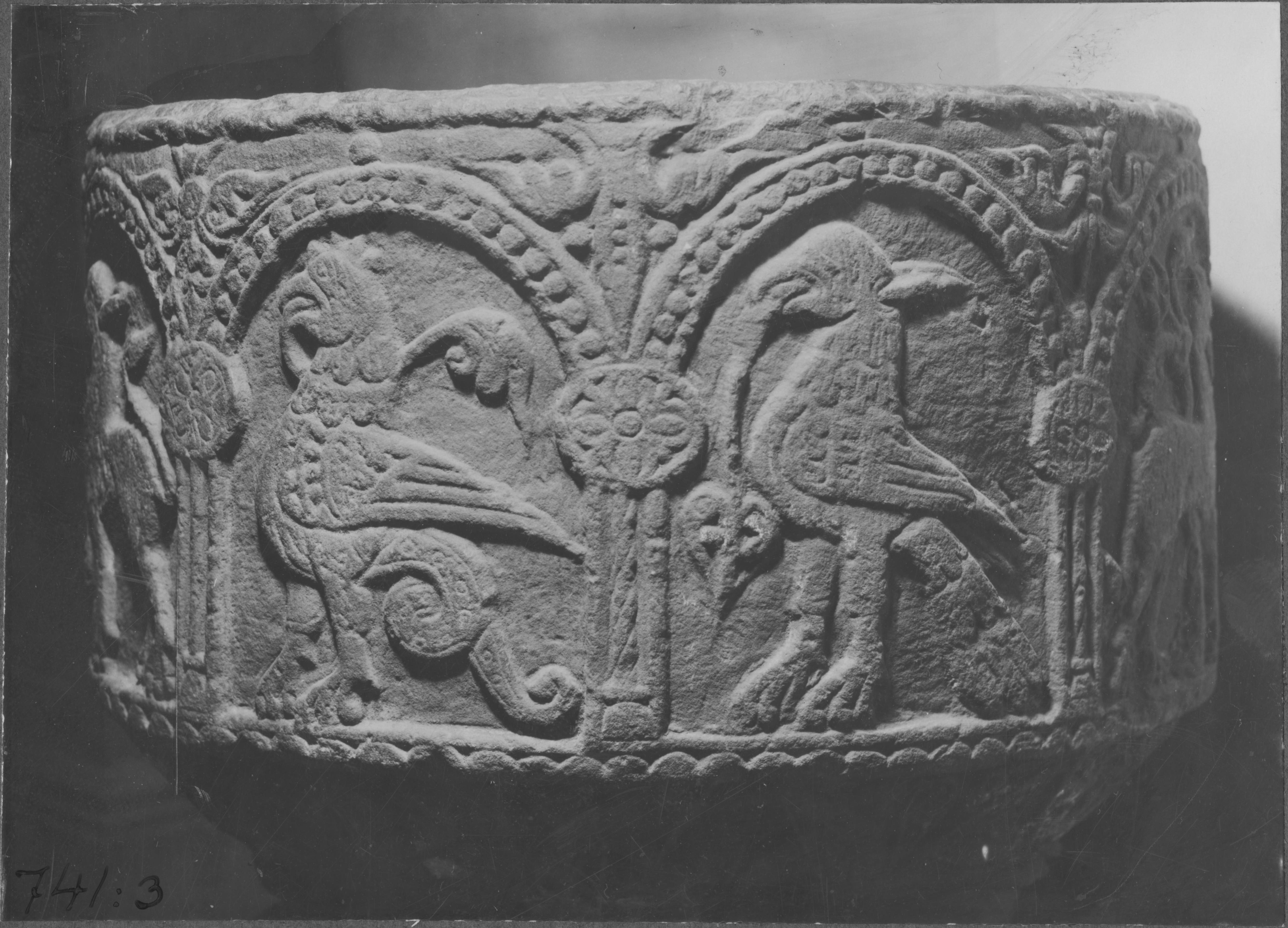 Beskrivning: Dopfunt av kalksten med huggna figurer. Gåva till Statens Historiska Museum.