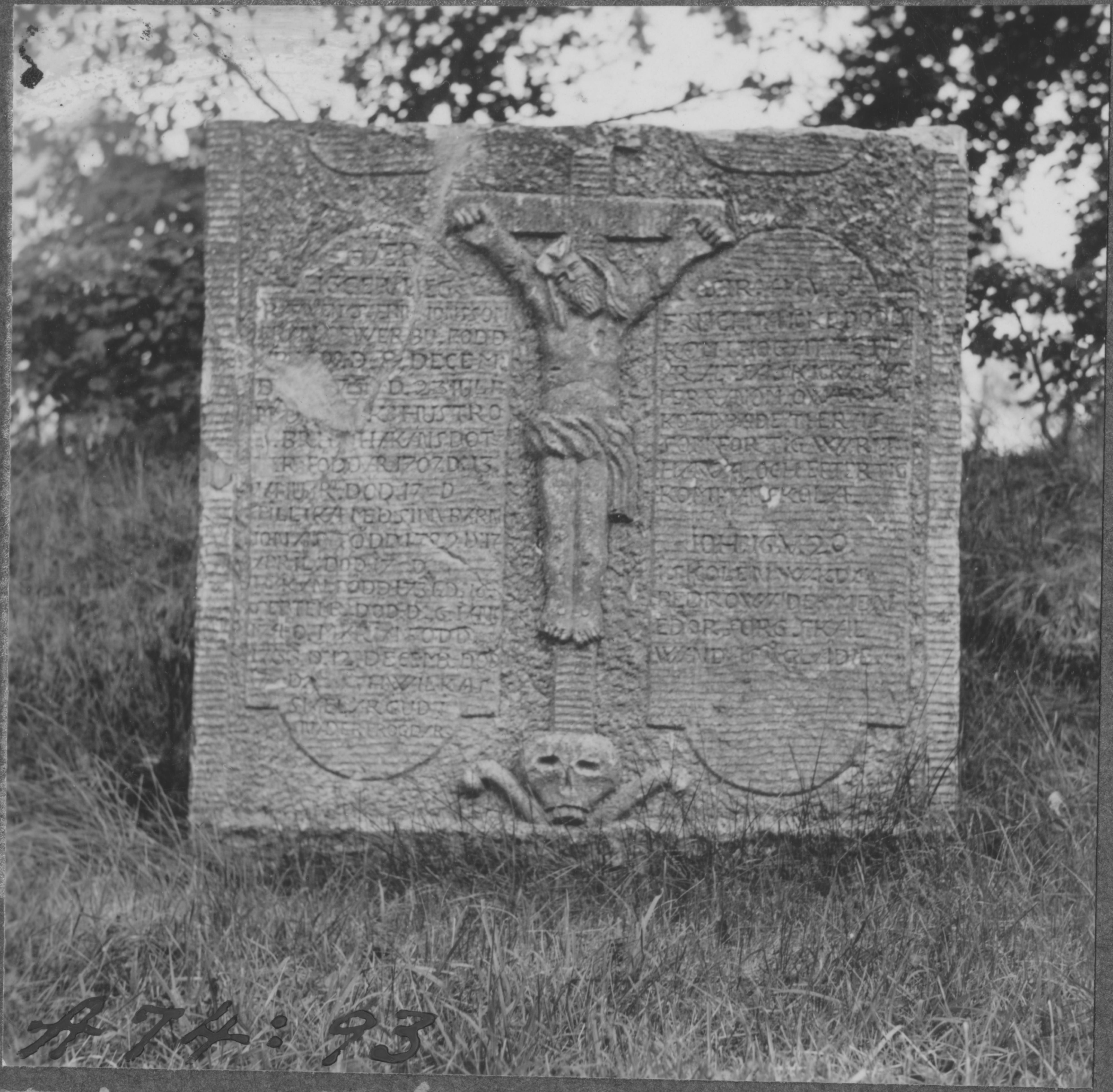 Beskrivning: Gravsten med Kristus på korset i relief.