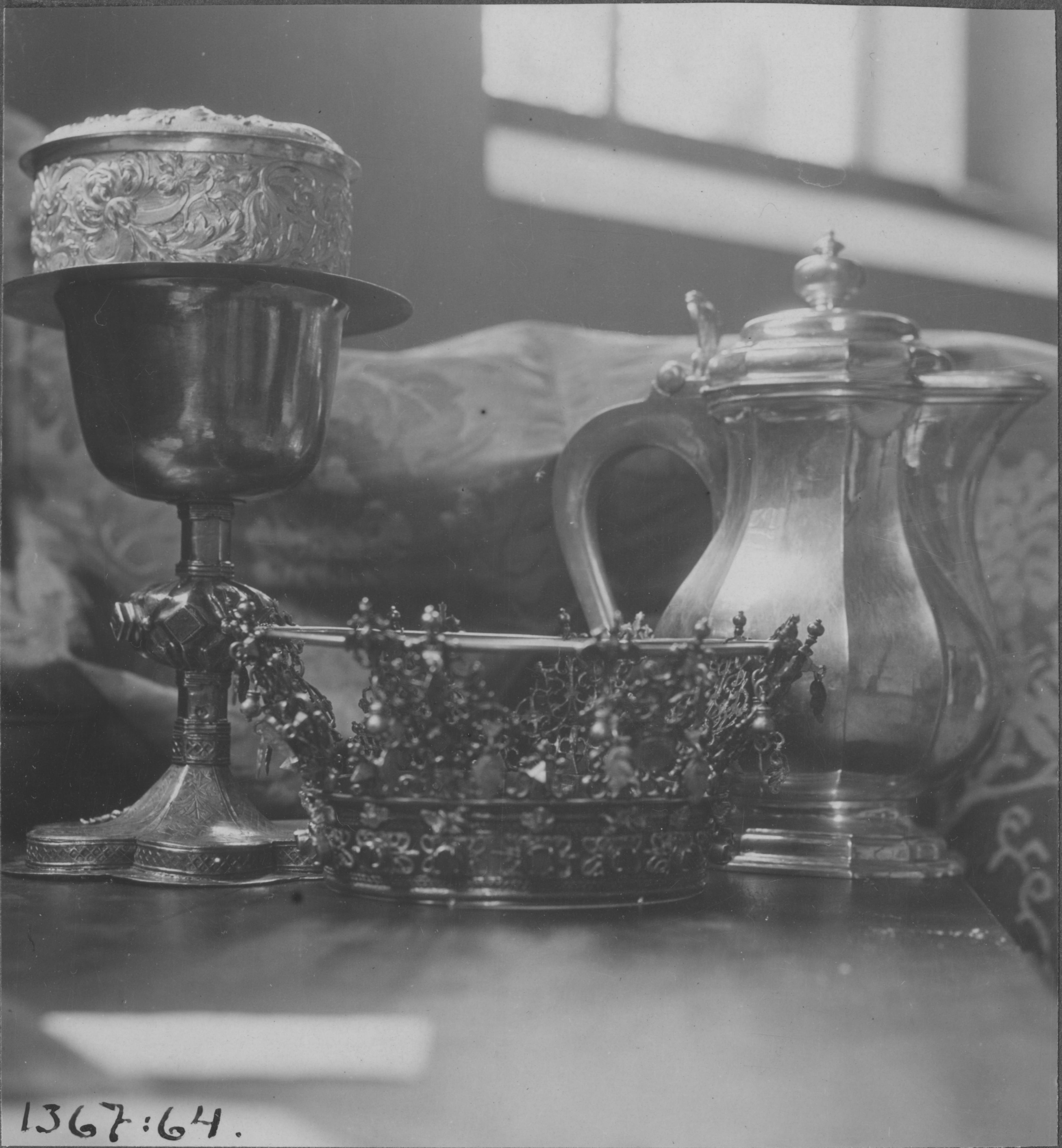 Beskrivning: Kalk av silver, förgylld. Sexpassformad fot varav tre är graverade med bladmotiv. Stor nod med rombiska sidytor. Medeltiden. Oblatask av silver med storbladiga rankor. 1600-talet. Brudkrona av silver, förgylld. Upptill bevingade änglahuvuden. Inköpt 1667. Kanna av silver, päronformad. Inskrift med årtalet 1742 februari. Snabbinventering.