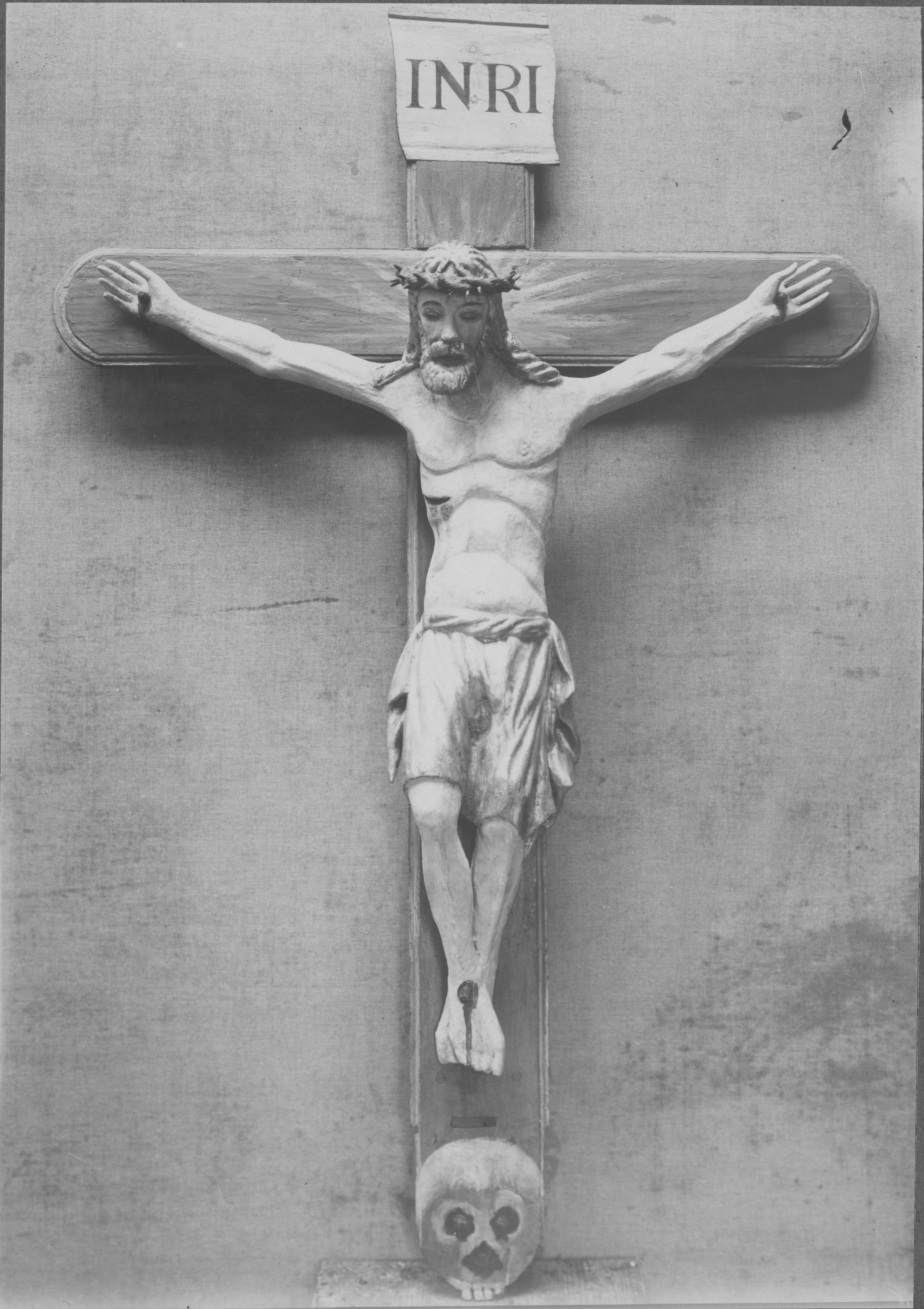 Beskrivning: Triumfkrucifix av trä, krederat och målat. Nedtill en målad dödskalle. 1500-talet? Efter konservering.