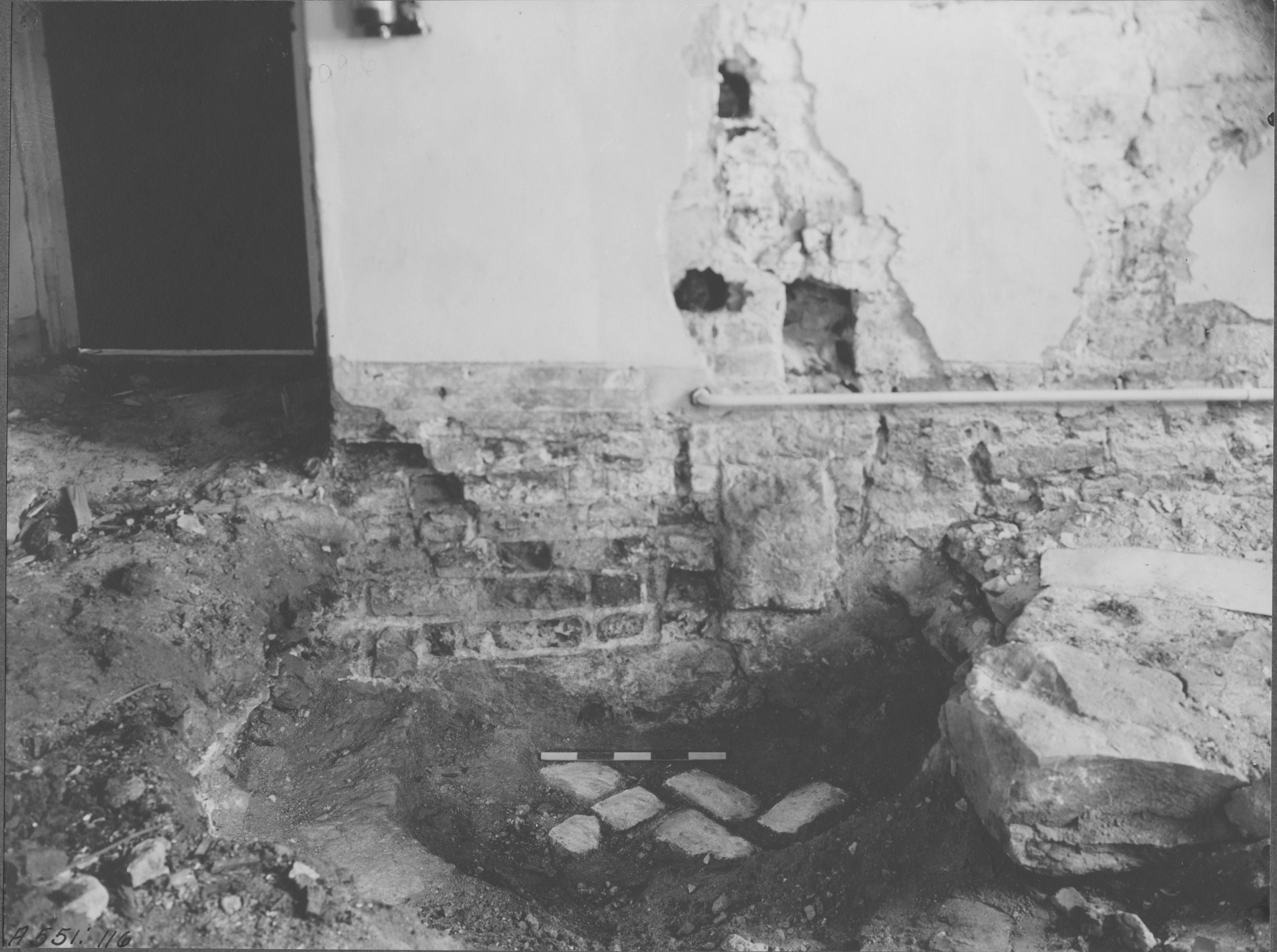 Beskrivning: Sakristian. Fragment av äldsta golvet vid västra väggen. Till vänster dörren till kyrkan. Byggnadsarkeologisk undersökning under golvet. Flera äldre golvnivåer framkom varav det äldsta daterades, med hjälp av brakteat, från 1300-talets mitt.