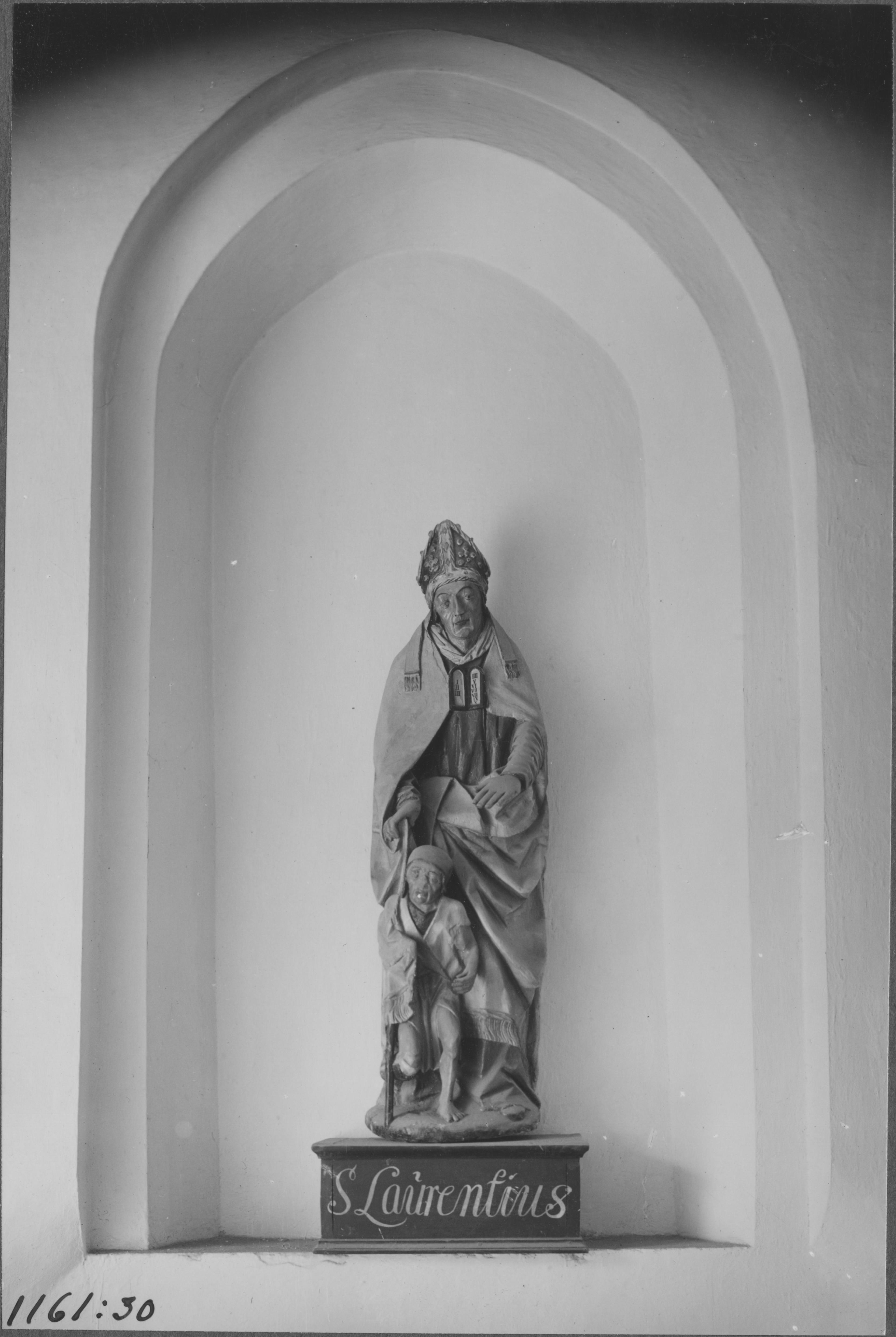 Beskrivning: Träskulptur föreställande S:t Laurentius, kyrkans skyddshelgon, iförd biskopsdräkt. Under kåpan en av biskopens skyddslingar. 1500-talets början.