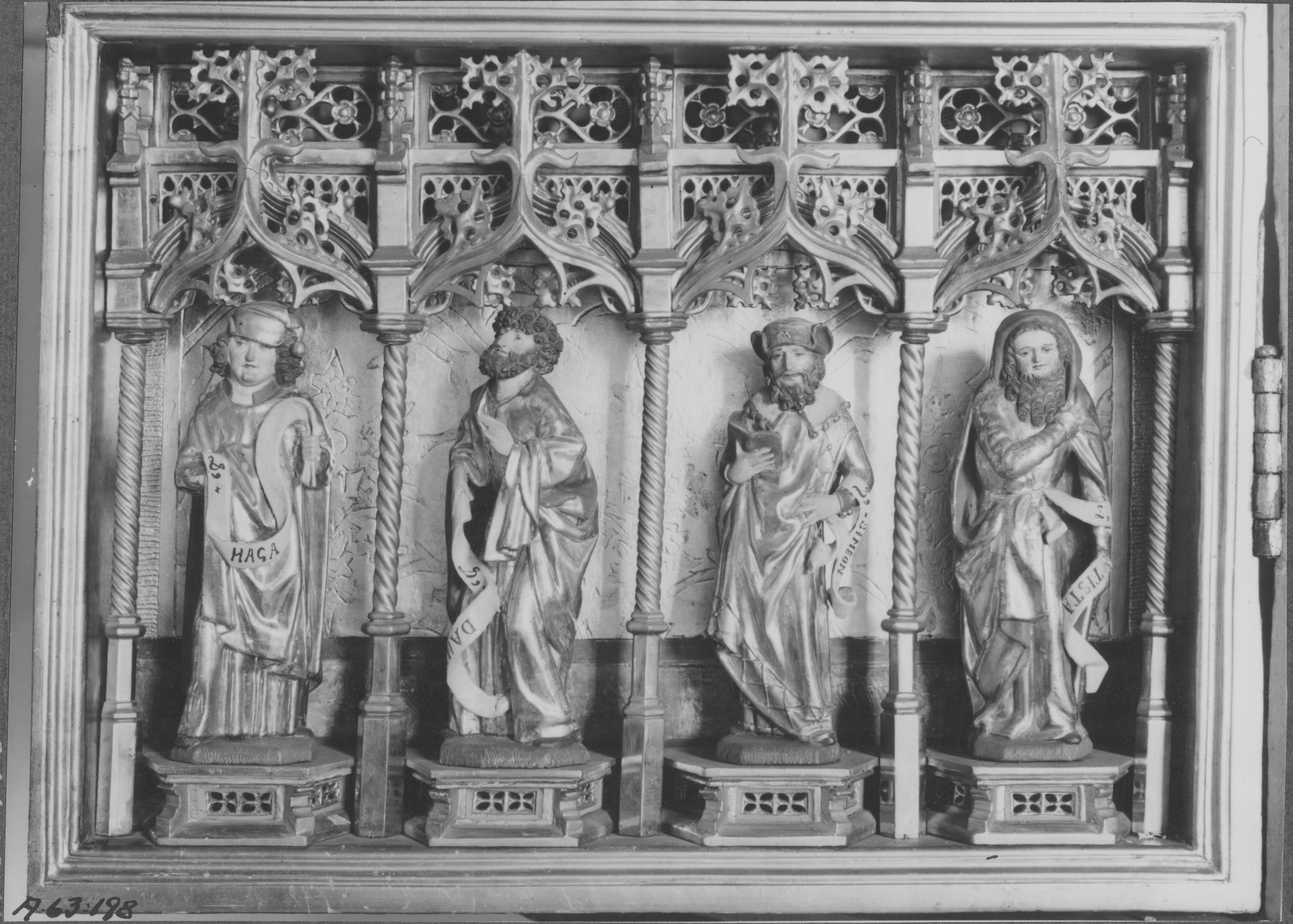 Beskrivning: Altarskåp av ek, krederat, förgyllt och målat. Inre vänstra altarskåpsdörren med helgonbilder, nedre delen. Nordtyskt arbete från 1500-talet.
