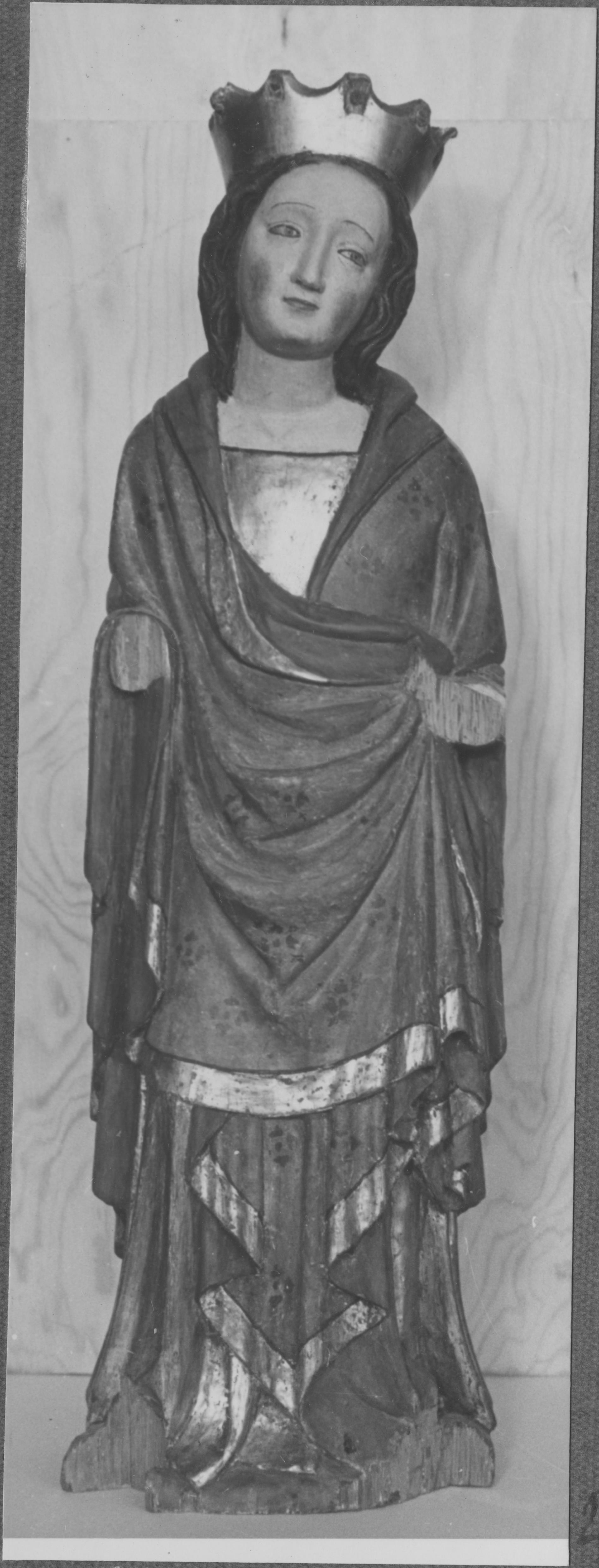 Beskrivning: Träskulptur föreställande kvinnligt helgon. 1400-talets mitt. Efter restaurering 1942.