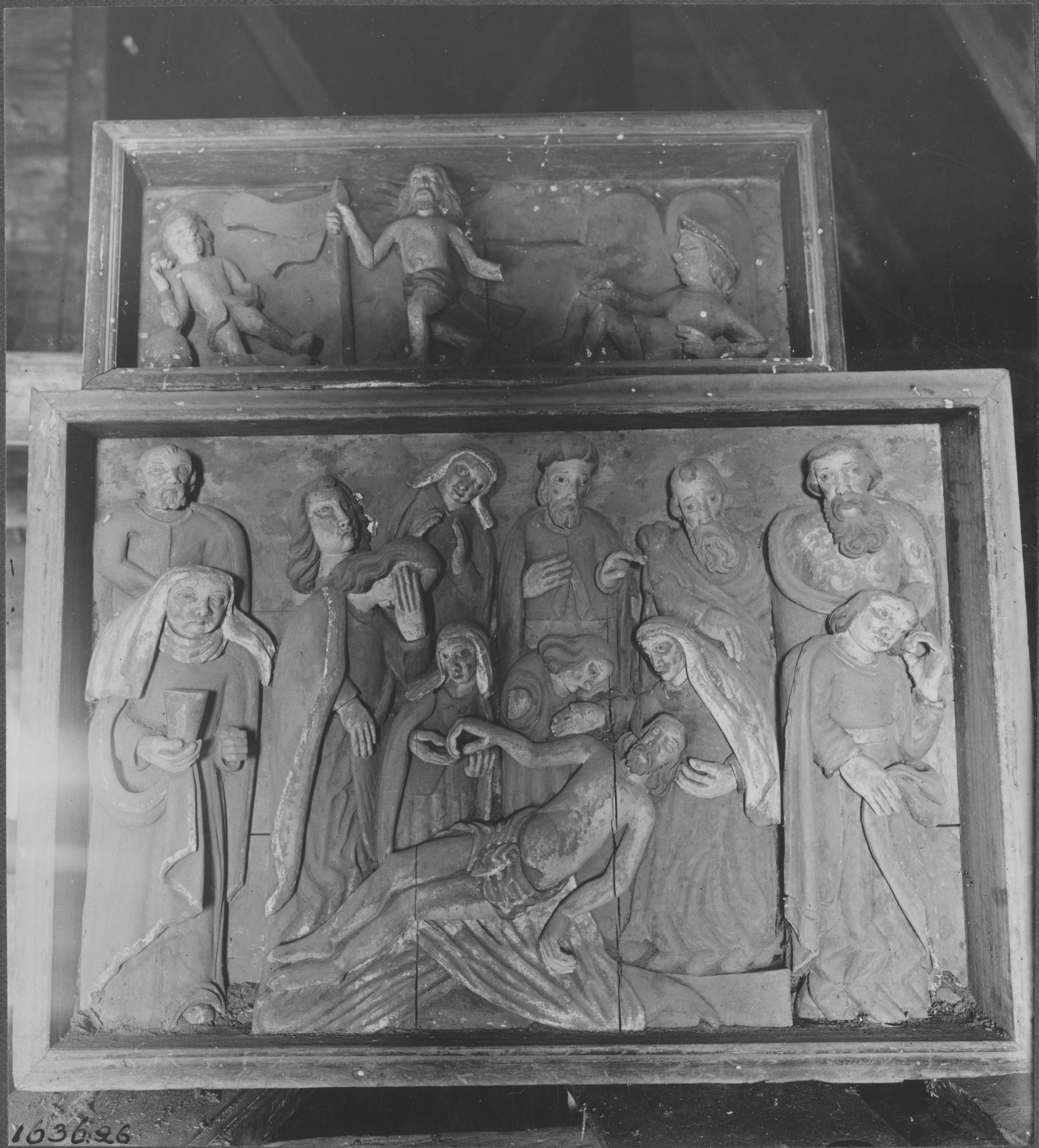 Beskrivning: Altarskåp i två avdelningar av skulpterat och målat trä. I nedre delen Kristus begråtes omgiven av sörjande. I övre delen Kristus springande omgiven av två krigare. 1695. Snabbinventering.