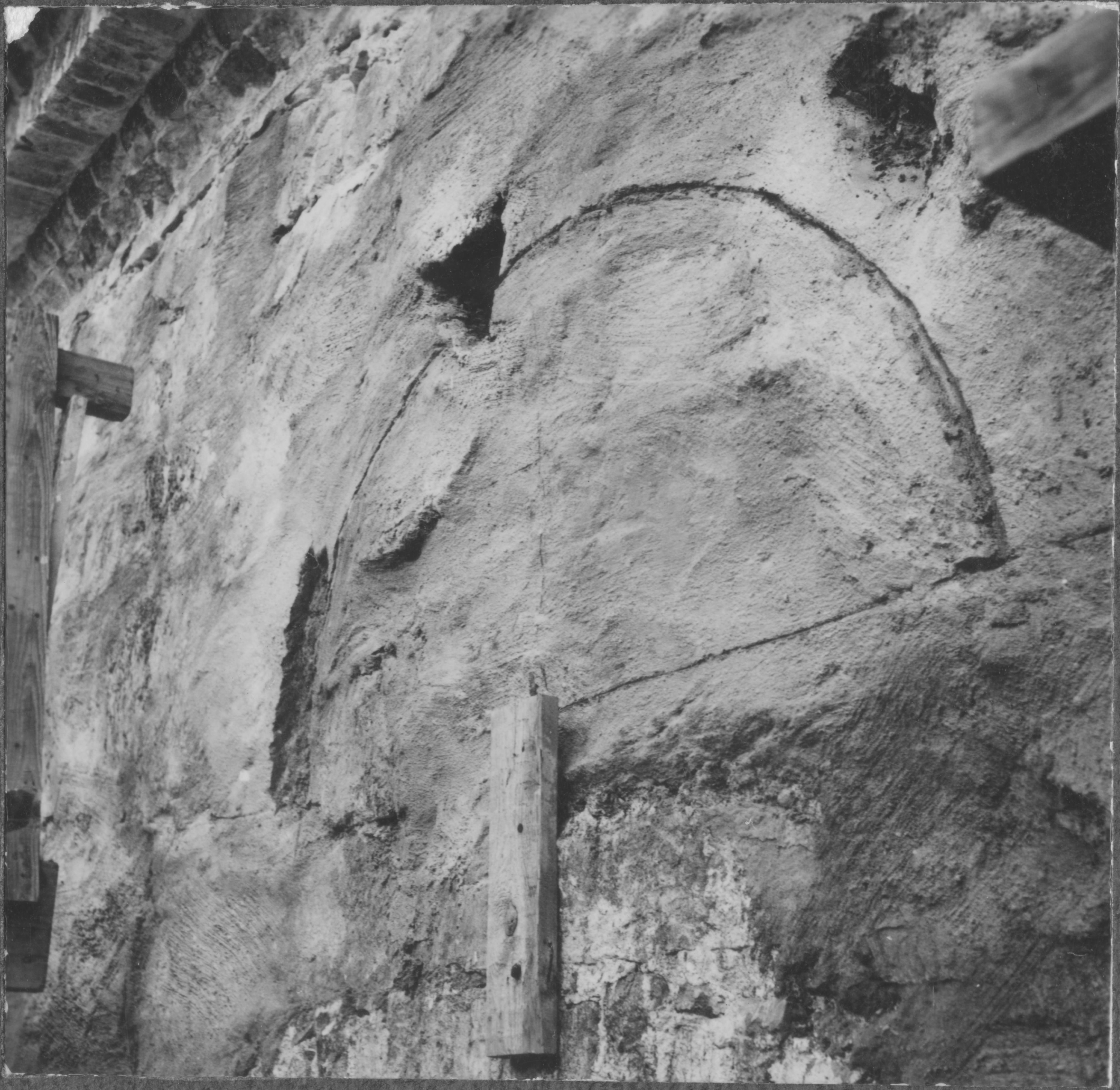 Beskrivning: Långhusets södra sida, spår av fönster över östra fönstret.