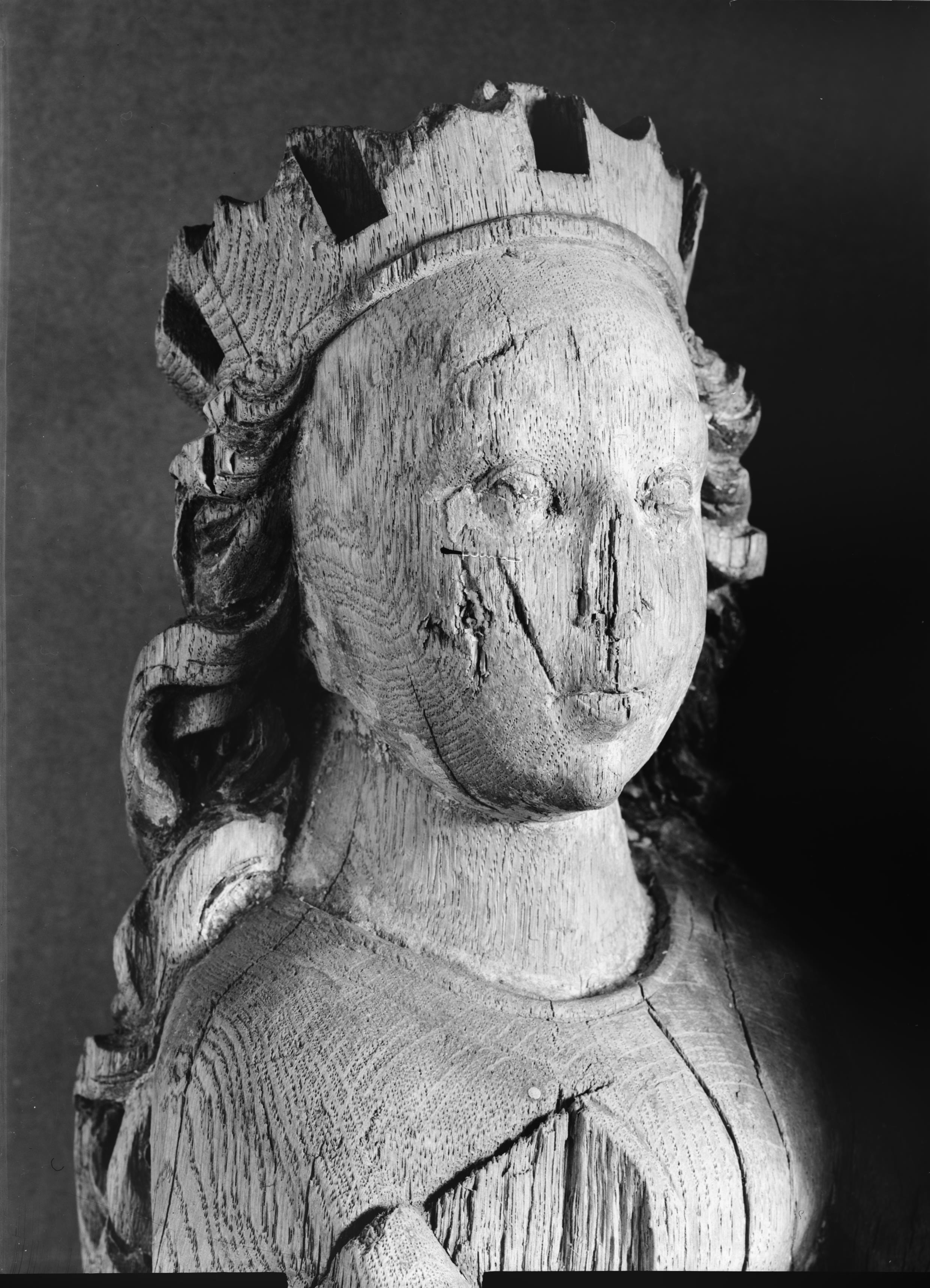 Beskrivning: Skulptur av trä föreställande den heliga Anna med Kristus och madonnan, detalj av madonnan.