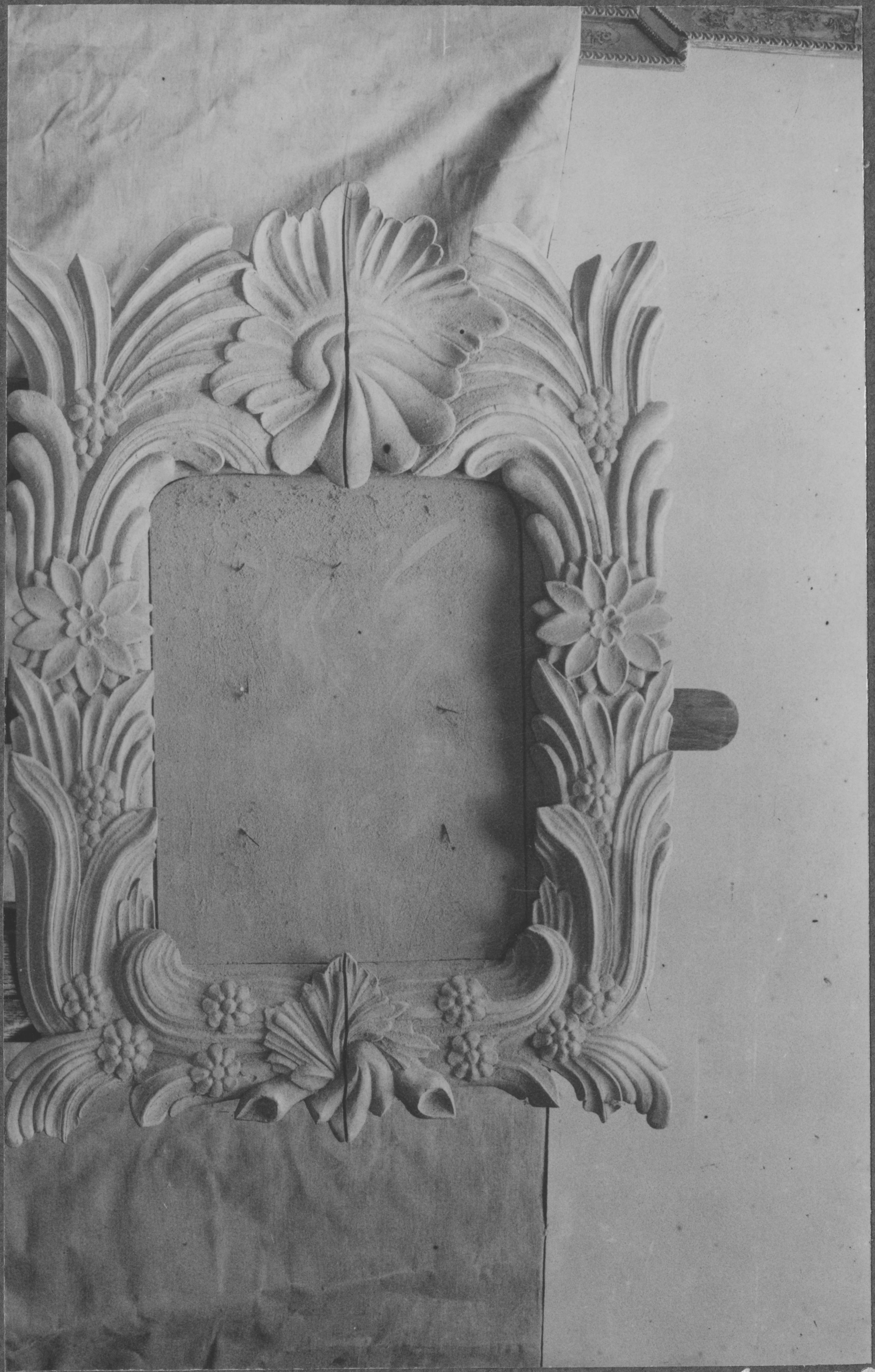 Beskrivning: Nummertavla med skulpterad ram i barockstil. Före konservering.