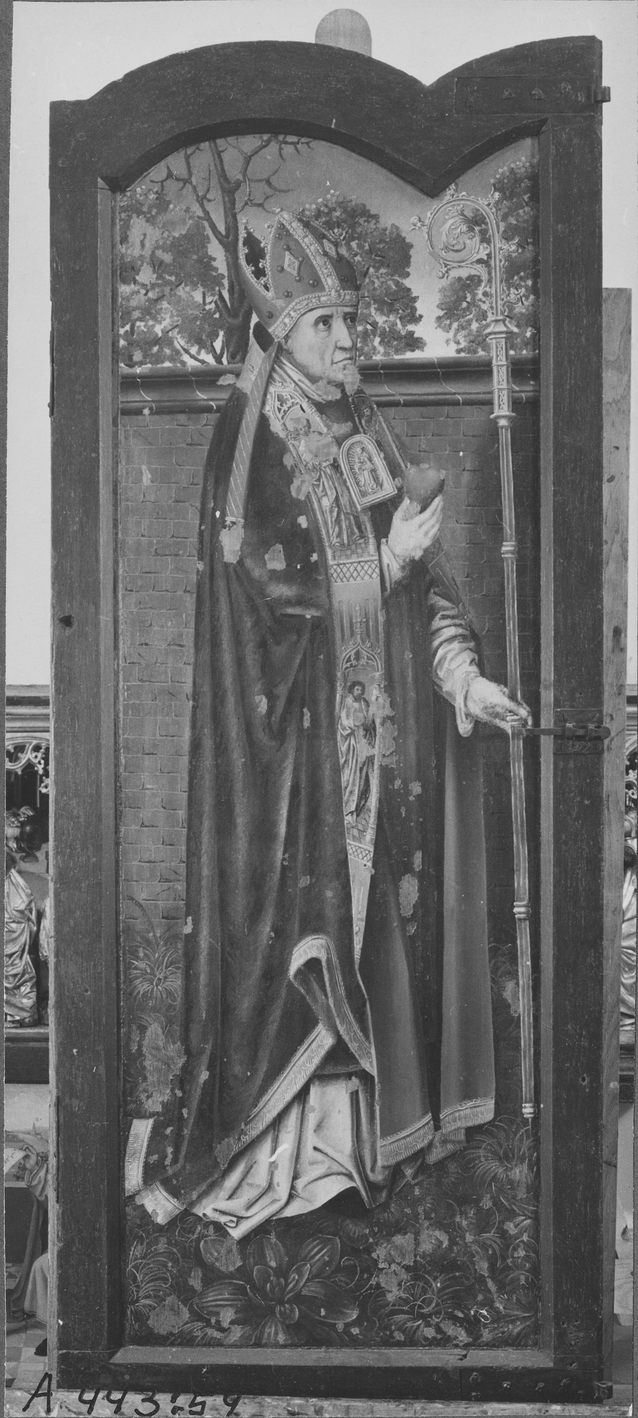 Beskrivning: Altarskåp av ek. Tillverkad i Brysselverkstad. Från 1500-talets första fjärdedel. Del av skåpets utsida.