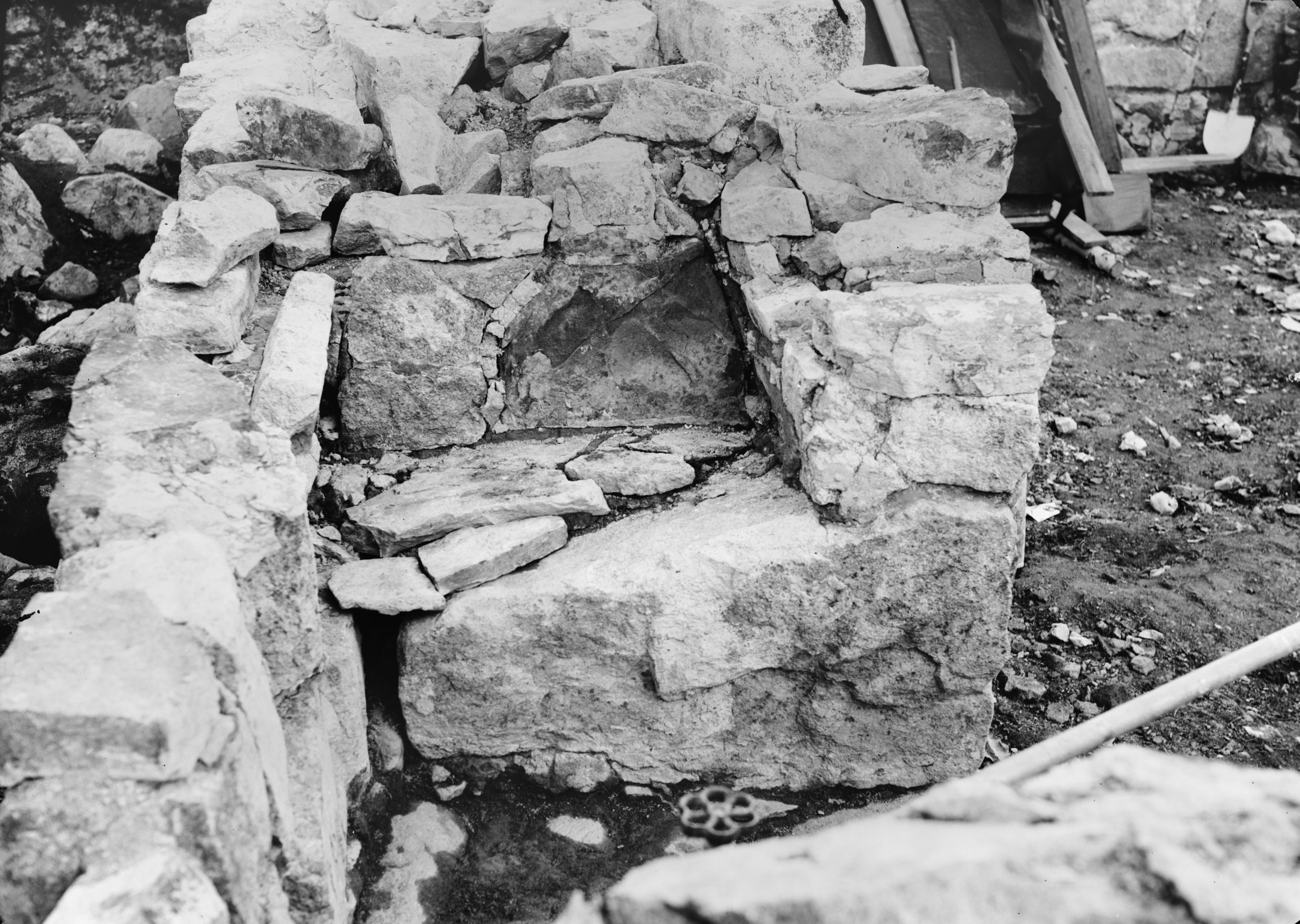 Beskrivning: Kyrkoruinen, lilla väggnischen. Under restaureringen.
