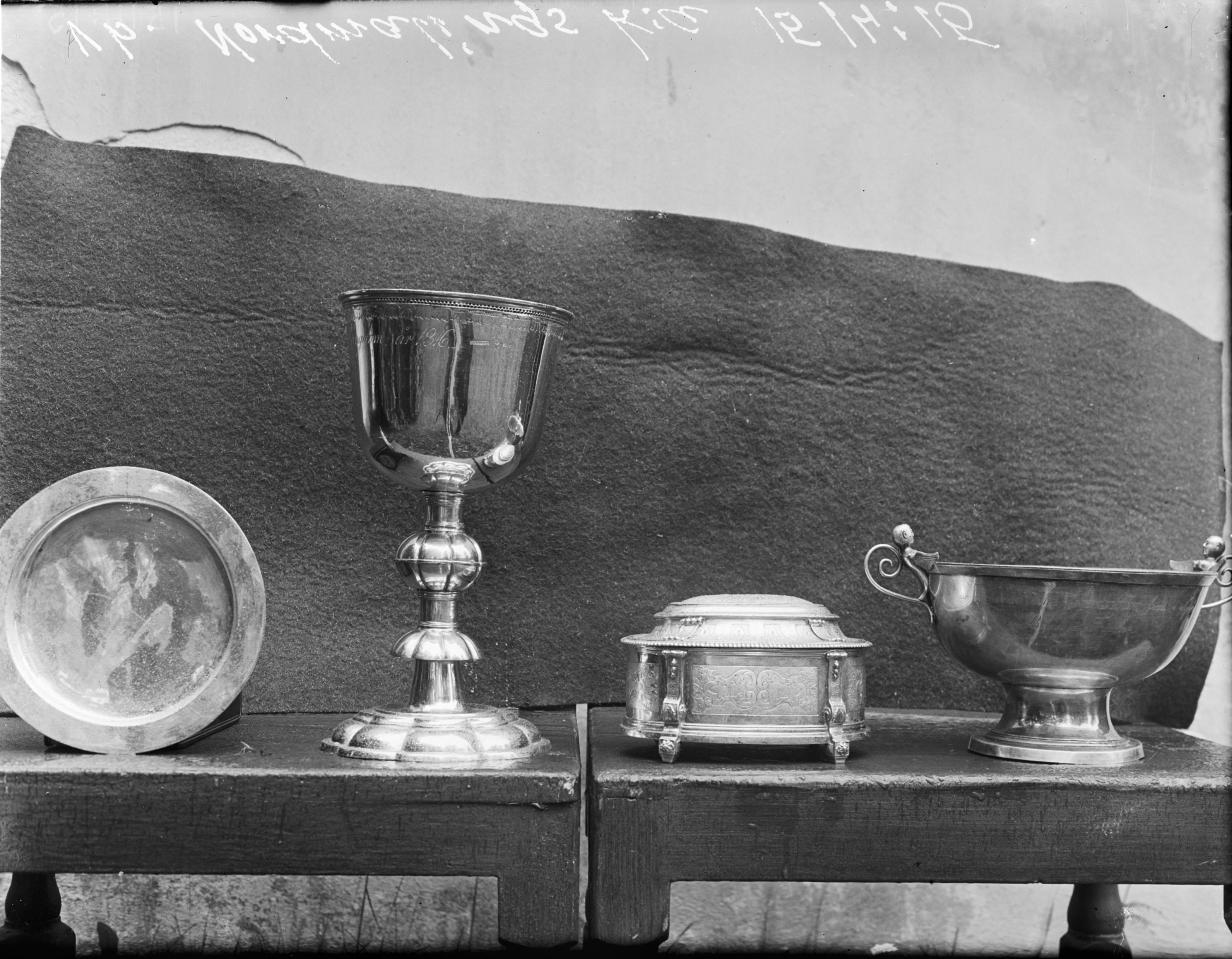 Beskrivning: Patén, kalk, oblatask, dopskål.
