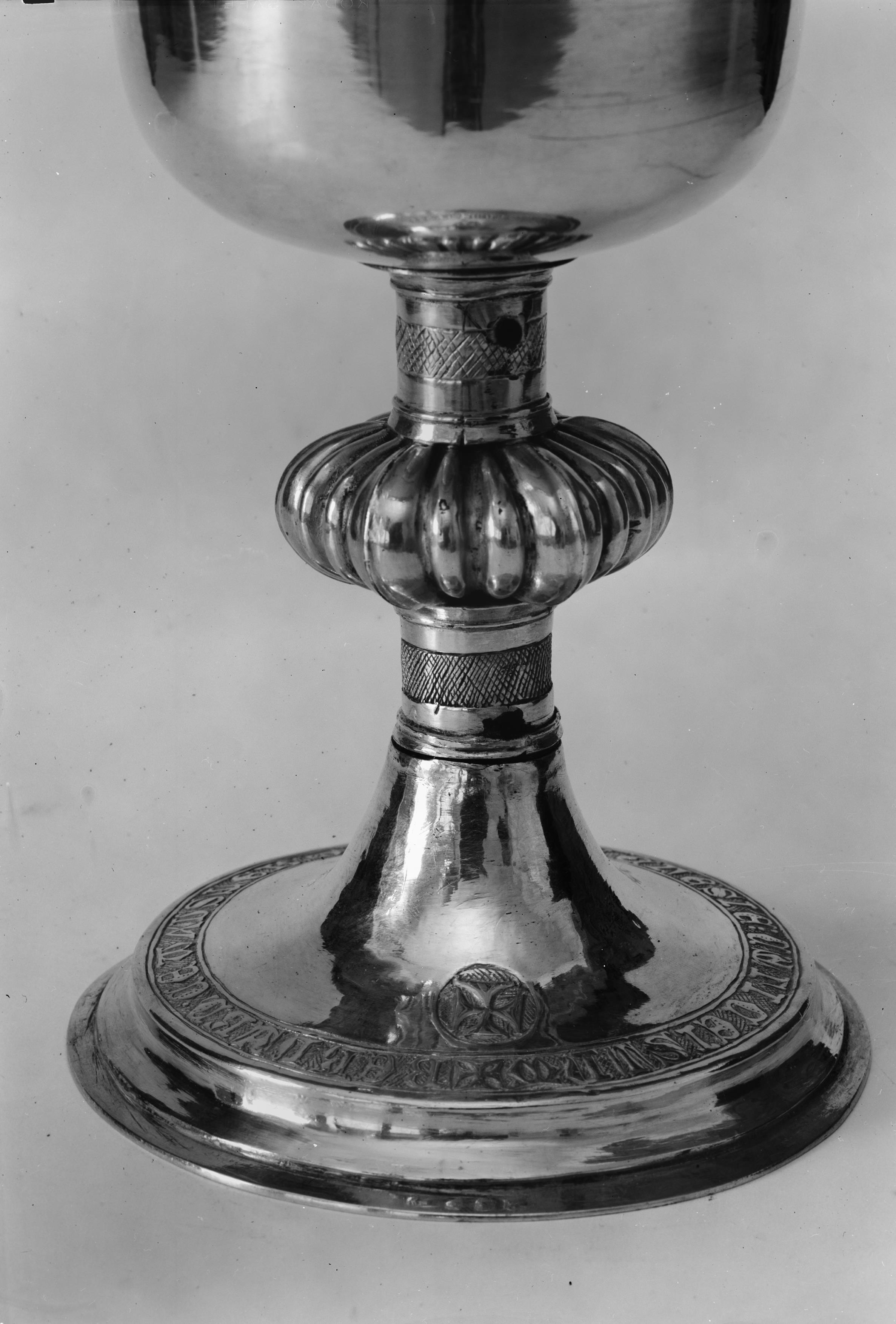 Beskrivning: Kalk av silver. 1300-tal. Detalj av nod och fot.