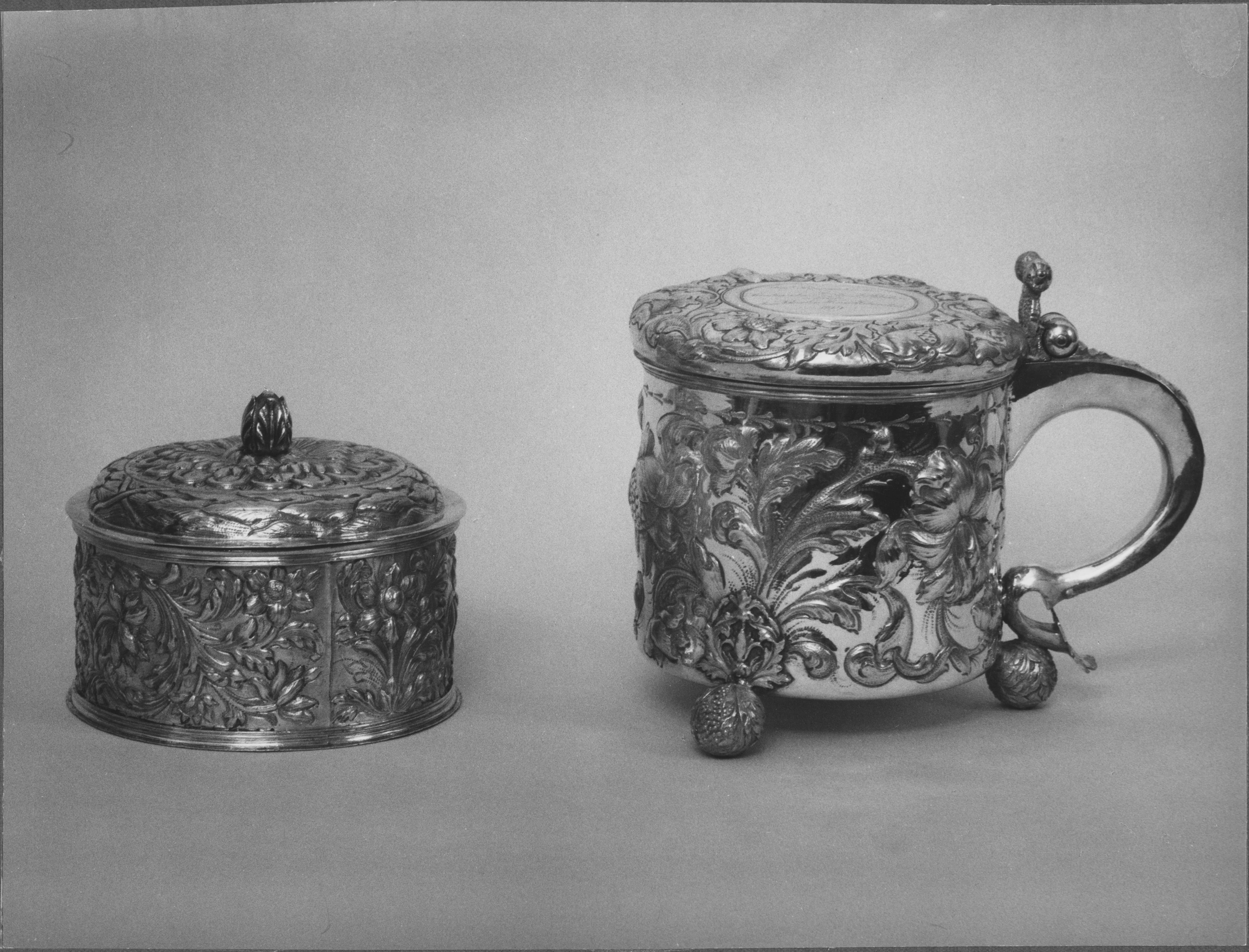 Beskrivning: Oblatask av silver med drivna och punsade blomornament. Omkring 1700. Vinkanna av silver. Cylindrisk på tre driva kulfötter, drivna bladornament.