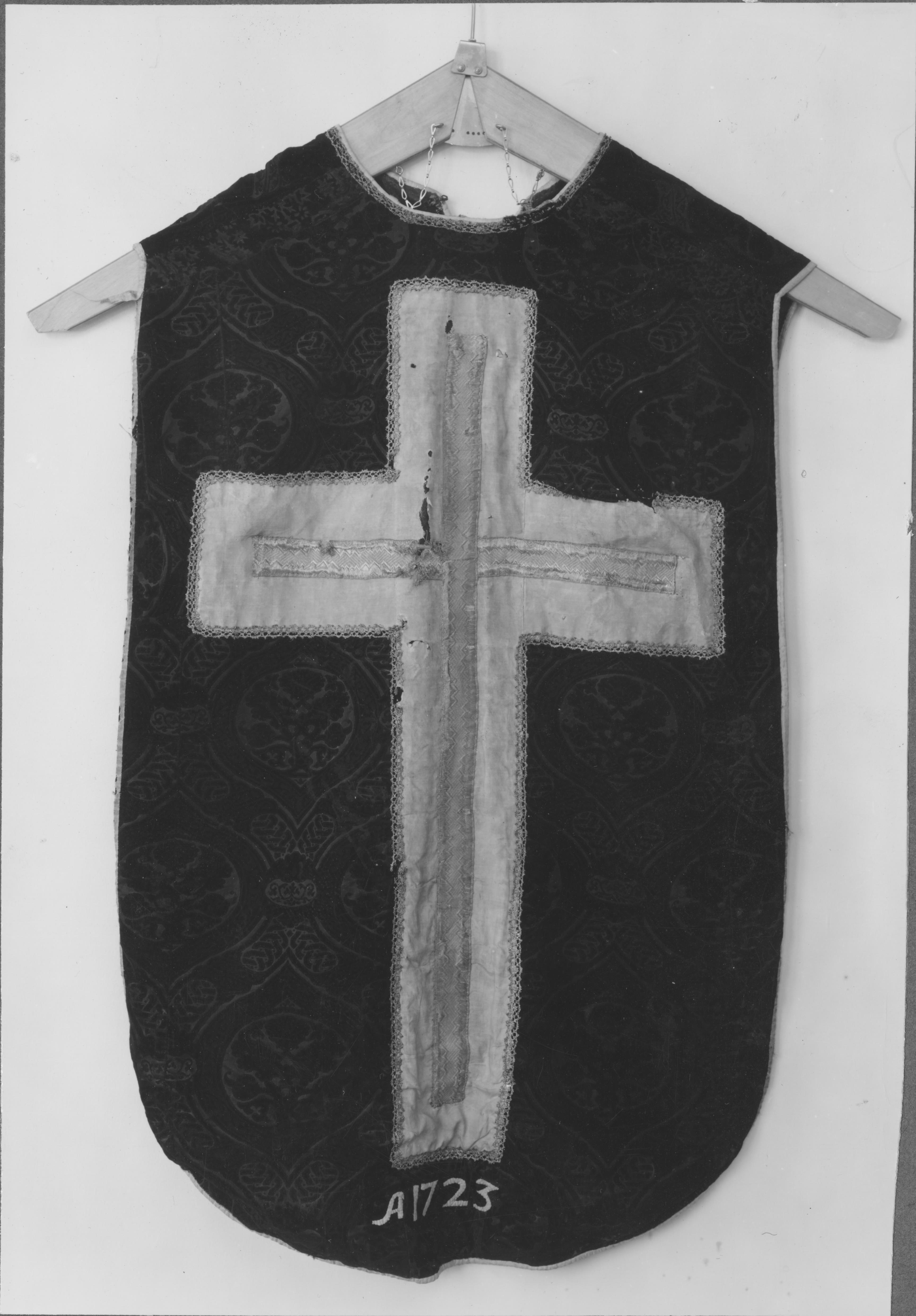 Beskrivning: Mässhake av svart mönstrad sammet. Ryggstycket med kors av vitt siden, guldgalon och guldspets samt A. 1723. Före konservering.