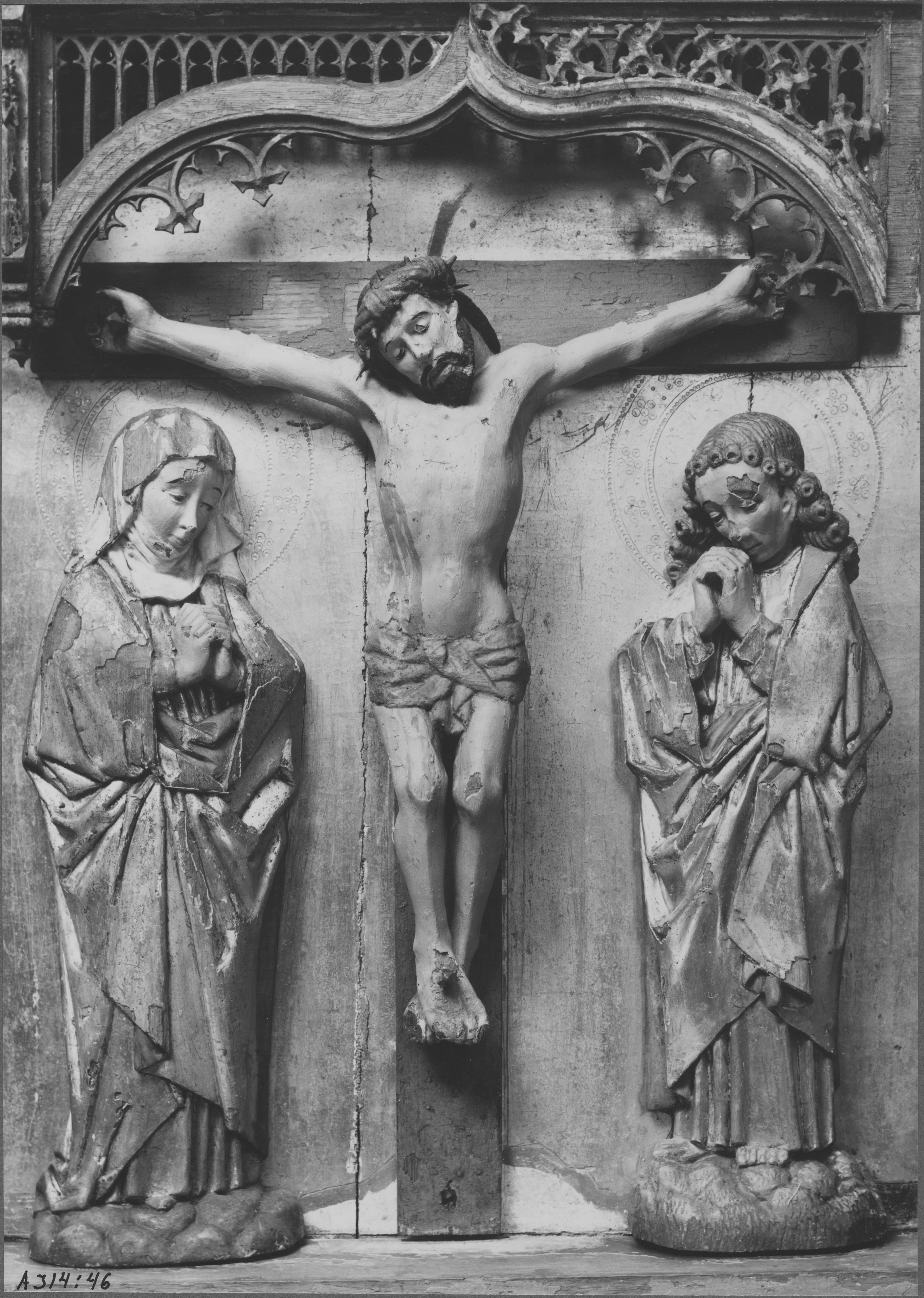 Beskrivning: Altarskåp med snidade träfigurer, detalj föreställande kalvariegrupp.