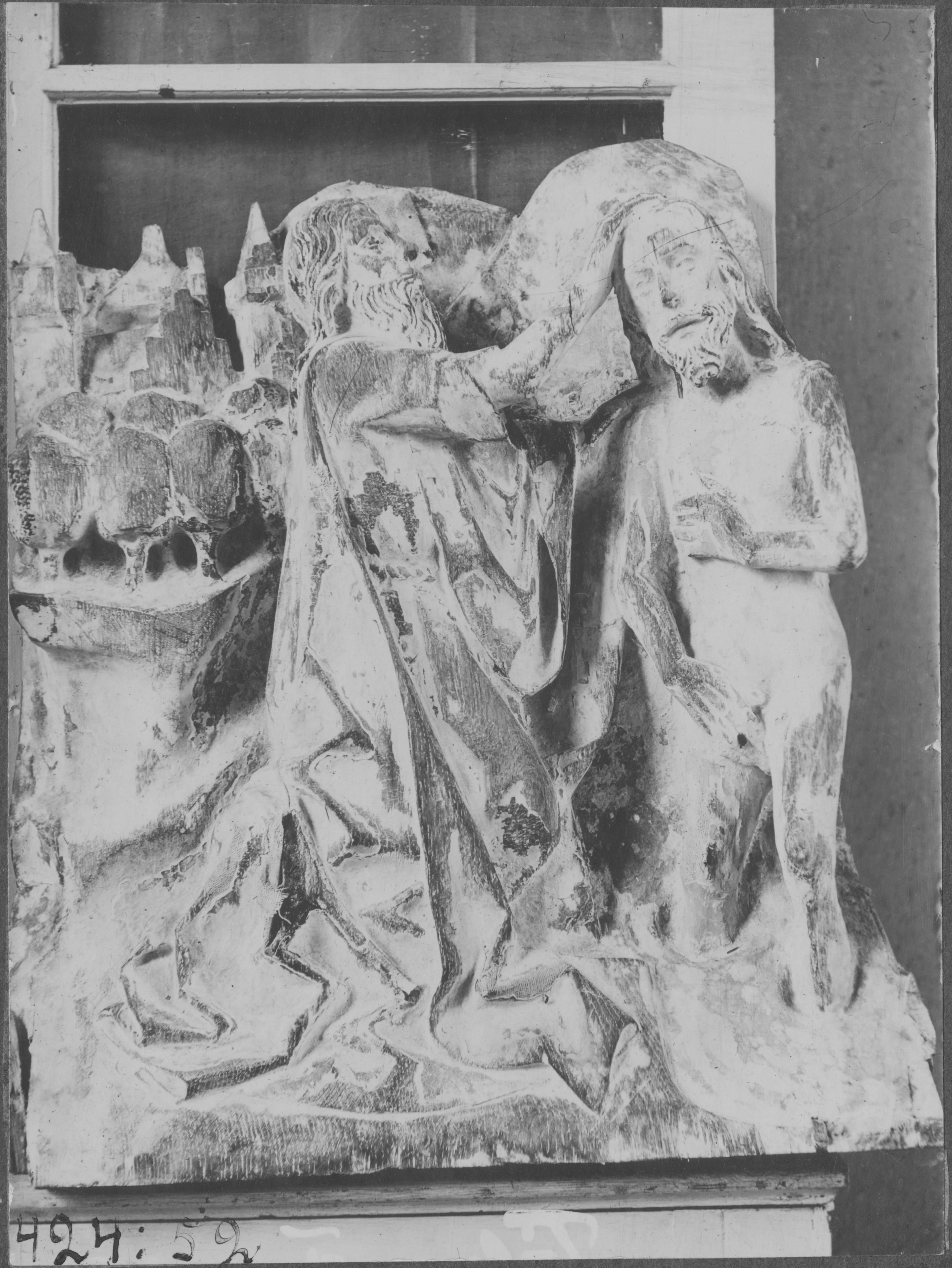 Beskrivning: Träskulptur föreställande Kristi dop. Kristus och Johannes med Jerusalem bakom sig. Krederad och målad. Har tillhört något altarskåp. 1400-talets senare hälft.