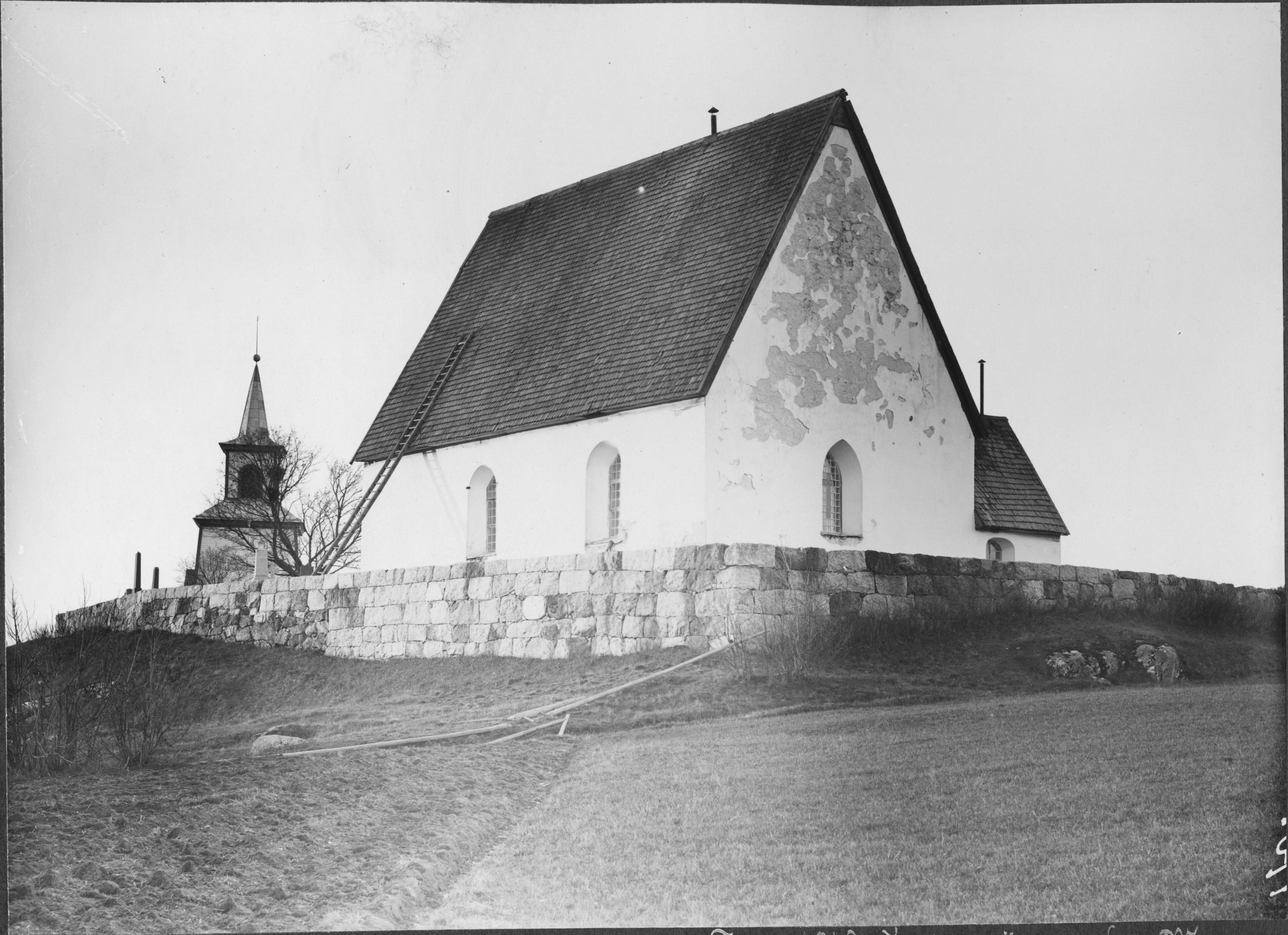 Beskrivning: Kyrkan med kyrkogårdsmuren.