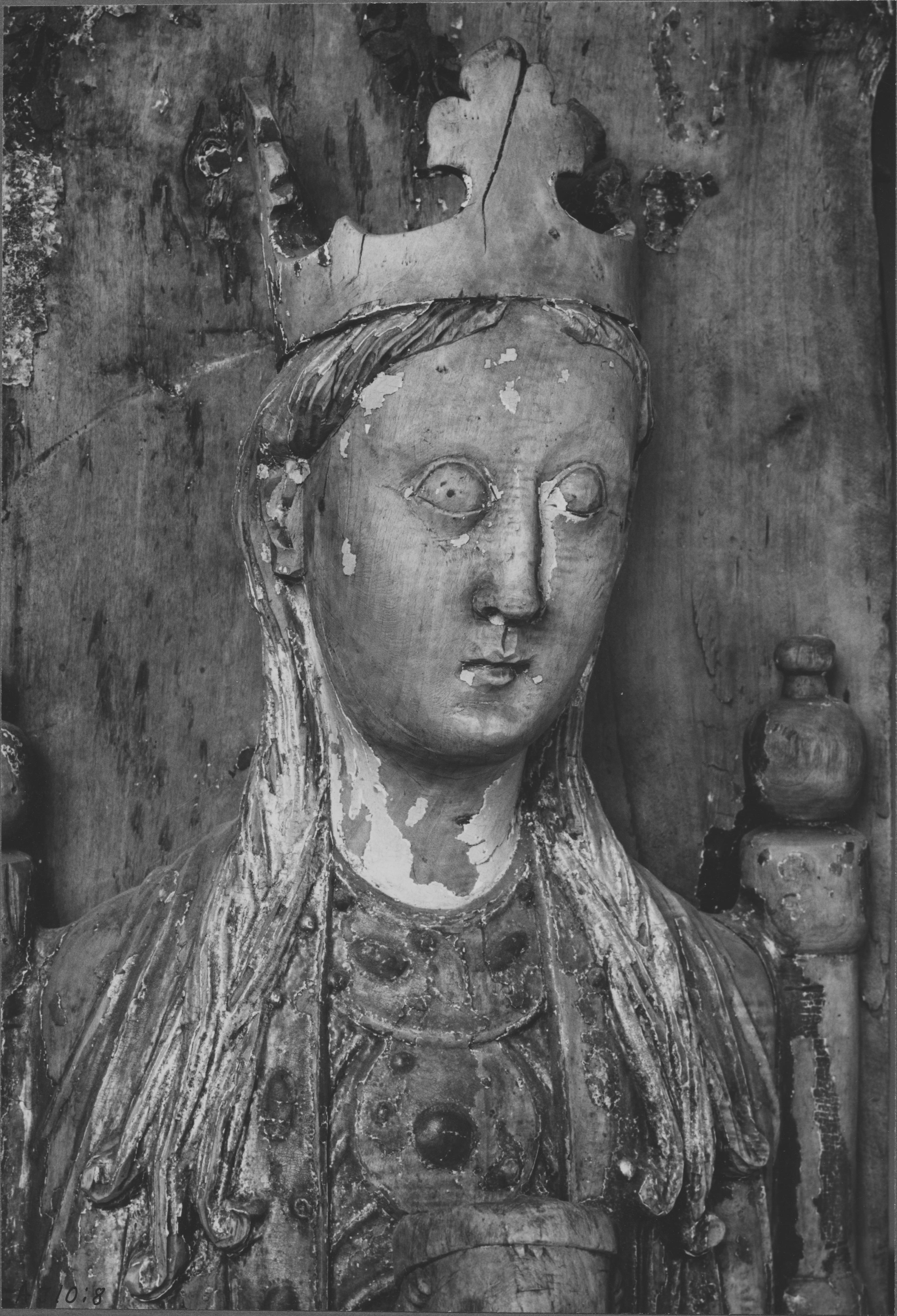 Beskrivning: Träskulptur föreställande Madonnan och barnet, detalj.